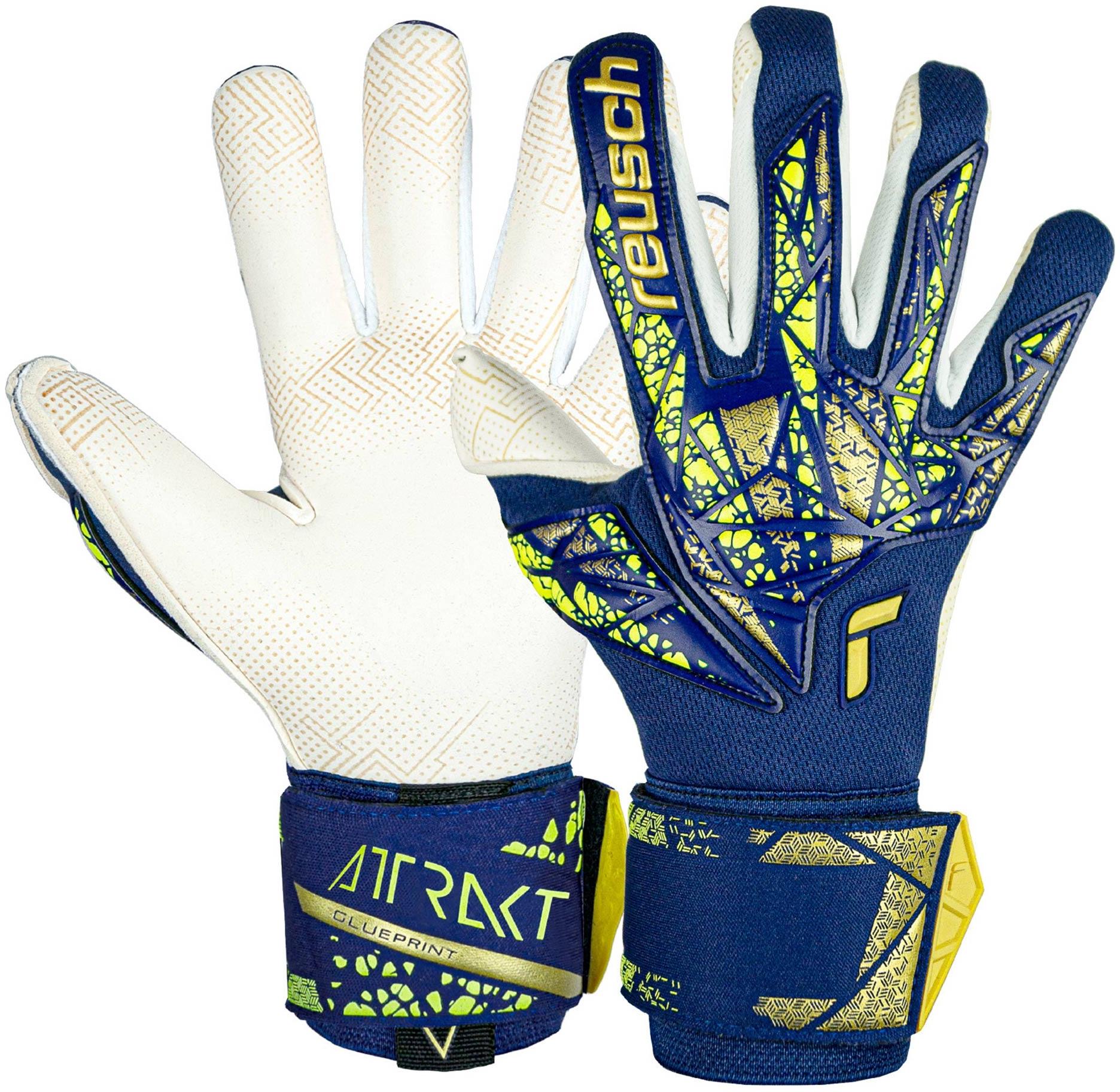 Tauche ein in die Welt des Torwartspiels mit dem Reusch "Attrakt Gold X GluePrint"! Der Evolution Negative Cut gewährleistet eine enge Passform und maximale Latex-Ball-Kontaktfläche für überragende Ballkontrolle. Die Innennahtkonstruktion im unteren Fingerbereich sorgt für Flexibilität und Anatomie. Der bewährte Verschluss aus dehnbarem Textil bietet optimale Passform und Stabilität am Handgelenk. Ein spezieller Klebedruck verstärkt den Griff an entscheidenden Stellen. Maximale Ventilation wird durch hoch atmungsaktives Mesh-Material erreicht. Der anatomisch vorgeformte Schnitt und die gerollte Konstruktion zwischen Daumen und Zeigefinger verbessern Passform und Tragekomfort. Erlebe mit dem "Attrakt Gold X GluePrint" unschlagbare Griffigkeit und optimalen Halt – Dein Schlüssel zu herausragender Torwartleistung!