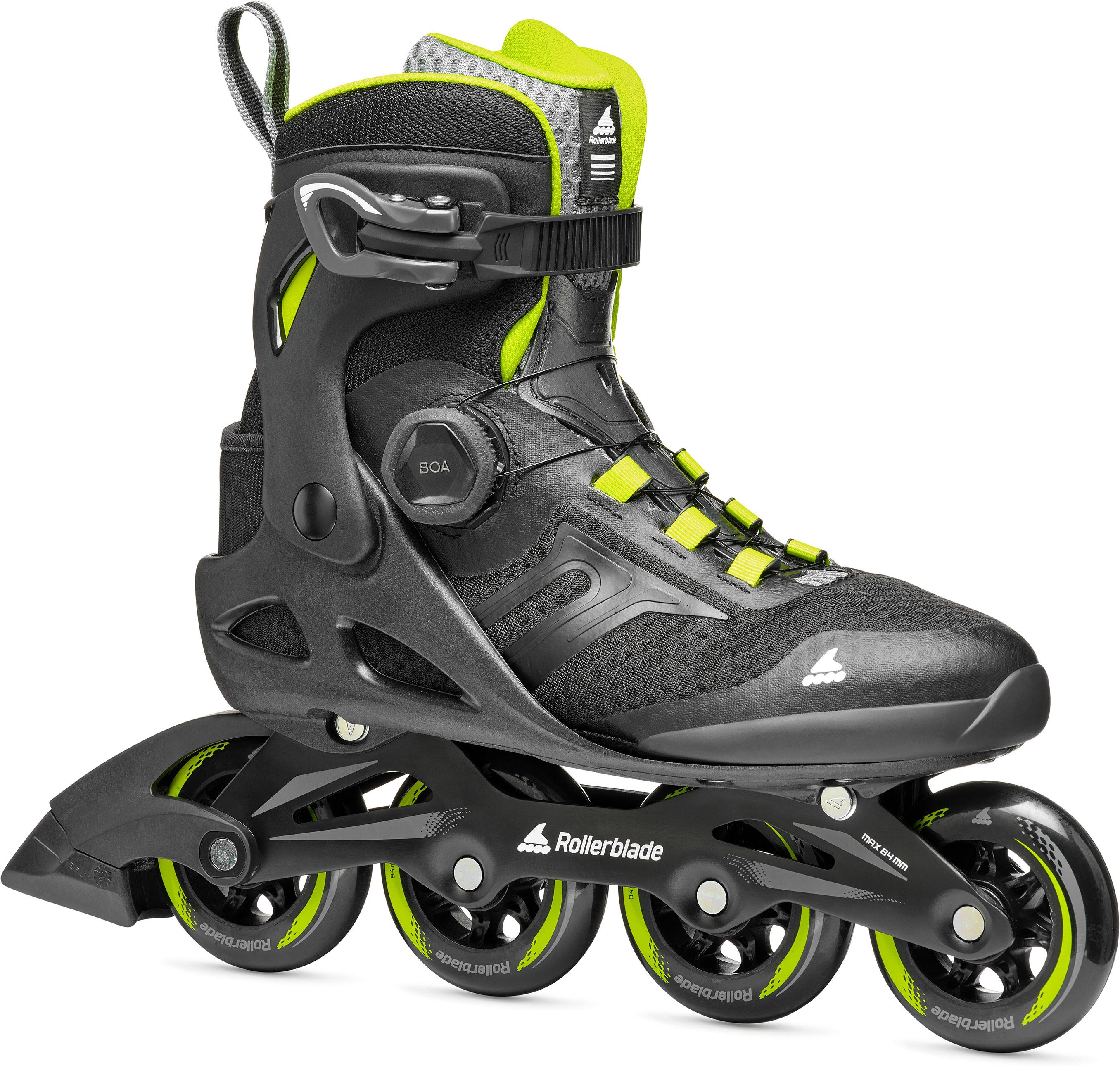Inline-Skates für Freizeitskater; idealer Halt für Anfänger; um eine Größe verstellbar; höherer Schaft; sockenähnliche Passform durch Zungen- und Knöchelpolsterung; einfach bedienbares BOA® Fit System verbessert zusätzlich den Fersenhalt; Ratschenschnalle am Schaft; atmungsaktives Mesh-Obermaterial; Twinblade-Aluminium-Schiene mit optimaler Kraftübertragung; vormontierte Bremse; Rollen mit 84 mm Durchmesser und 84a Härte; SG7-Kugellager.