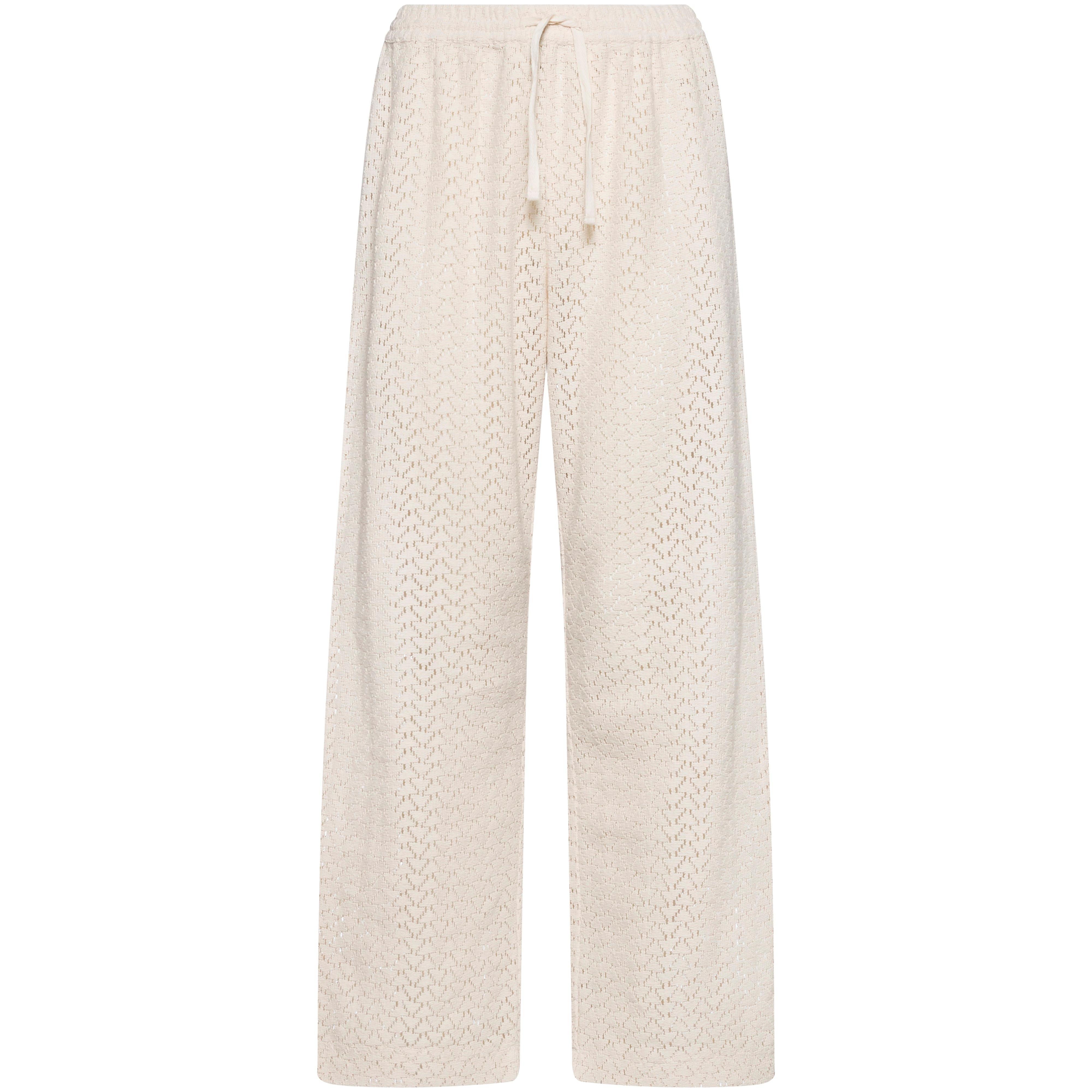 Weite Stoffhose mit raffiniertem Lochmuster; elastischer Bund mit Kordelzug; Material 98% Baumwolle, 1% Polyester, 1% Viskose.
