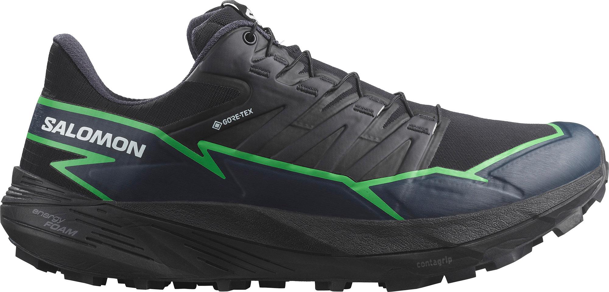 Trailrunning-Schuhe mit dynamischer Dämpfung und optimalem Wetterschutz; ideal für Berge und Trails, aber auch für Wald und Feldwege geeignet; Obermaterial aus atmungsaktivem, schmutzabweisendem Mesh mit strapazierfähigen Synthetik-Überzügen; wind- und wasserdicht sowie atmungsaktiv dank GORE-TEX Membran; Quicklace™-Schnellschnürsystem, welches sich mit einer Hand bedienen lässt; Textilfutter; leichte, dämpfende Energy Foam-Mittelsohle mit federndem Effekt; All Terrain Contagrip®-Außensohle für langlebigen Grip und ein sicheres Laufgefühl auf unterschiedlichen Untergründen sowie bei wechselnden Wetterbedingungen; Noppentiefe: 5 mm; normale Schuhweite; neutrale Pronation; mit Recyclingmaterial hergestellt; Gewicht: ca. 600 g (Paar).