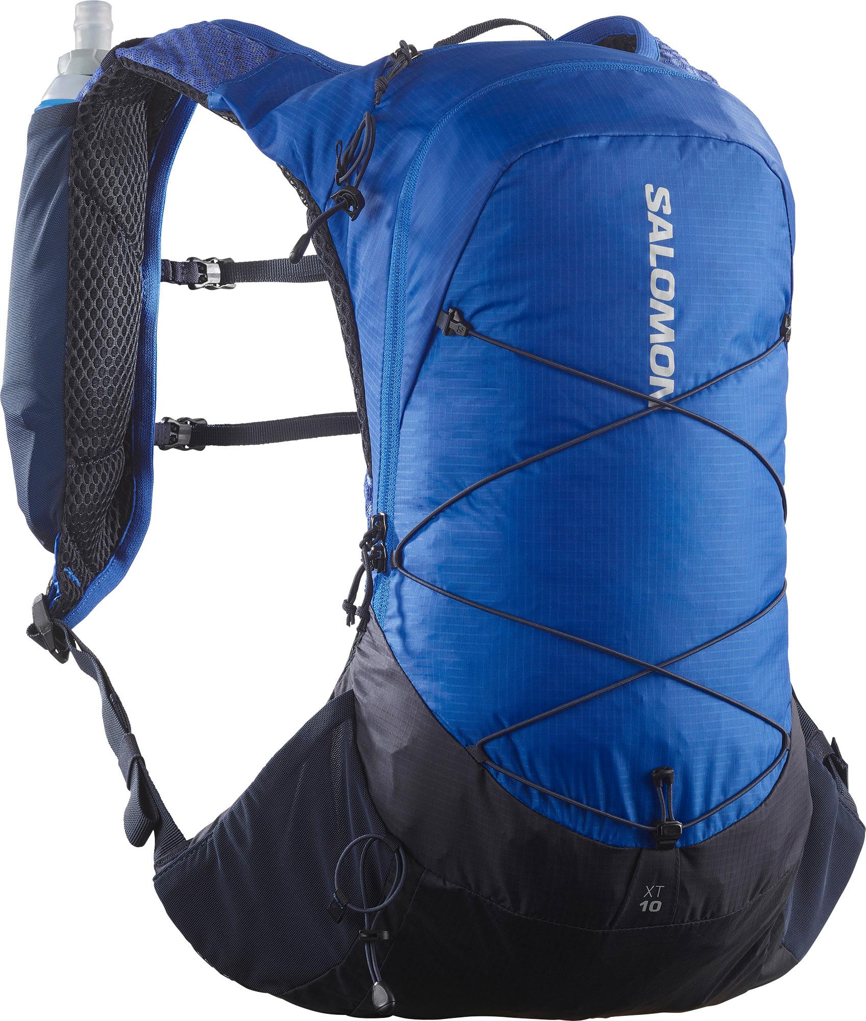 Stabiler, trinksystem-tauglicher Rucksack mit vielen Verstaumöglichkeiten und gepolstertem Rückensystem; doppelt verstellbarer Brustgurt; 1 Hauptfach; 1 externe Reißverschlusstasche auf der Oberseite für einen schnellen Zugriff; 1 Innenfach mit 2 l Trinkreservoir; mit 2 Soft-Flaschen (Fassungsvermögen 500 ml) kompatibel; elastische Ausrüstungs- und Schlüsselhalterung; Stockhalterung; Kompressionsriemen; reflektierende Details; Signalpfeife; Volumen; ca. 10 l; Maße (H/B/T): ca. 45 x 27 x 30 cm; Gewicht: ca. 345 g; Obermaterial 100% Polyamid, Futter 100% Polyester.