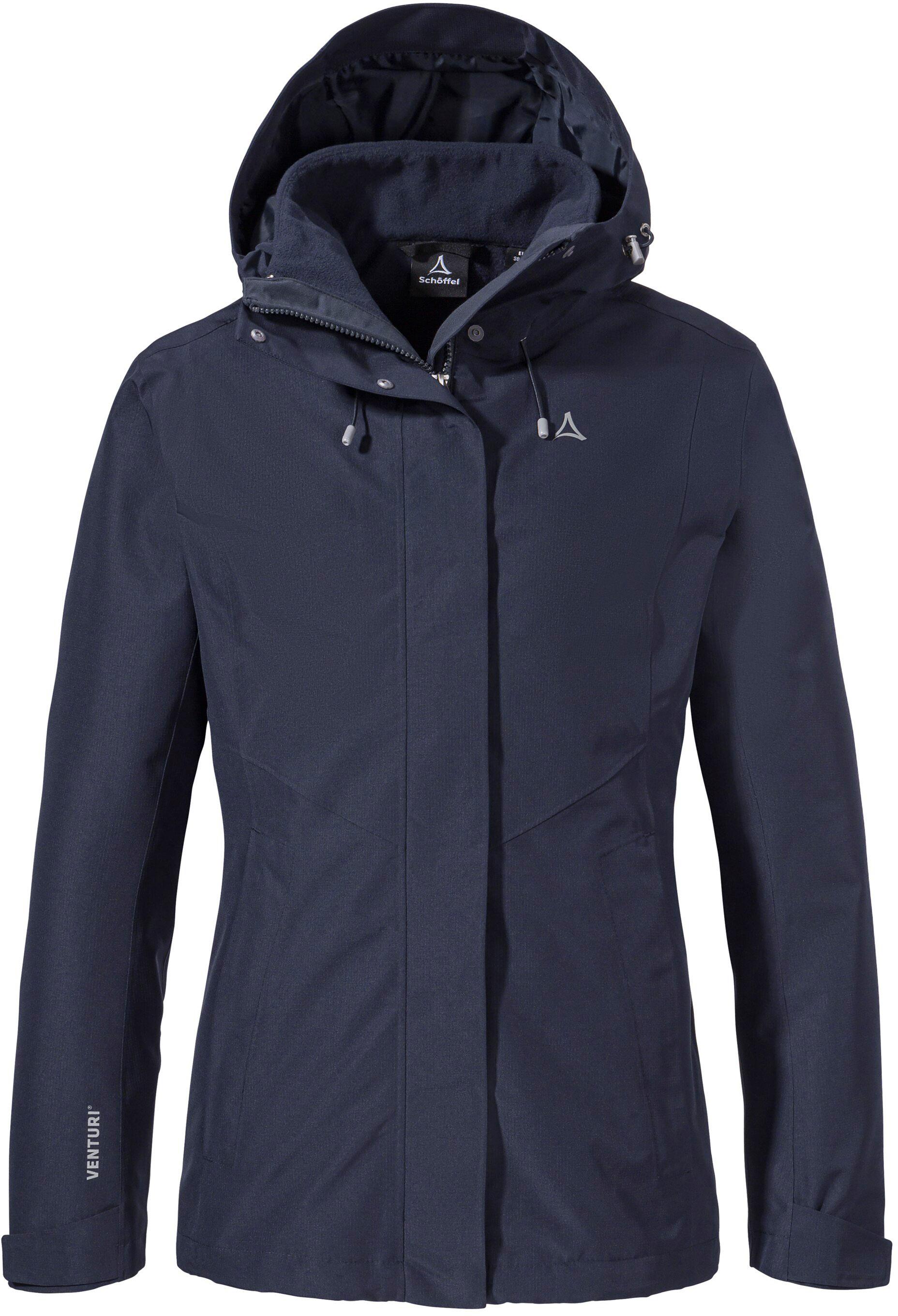 Doppeljacke mit wetterfester Außenjacke und wärmender Innenjacke; Außenjacke in zweilagiger Konstruktion mit Venturi®-Membran; dauerhaft wind- und wasserdicht sowie atmungsaktiv; Wassersäule: 10.000 mm; verstellbare Kapuze mit hohem Kragen; Frontreißverschluss mit Windschutzleiste; 2 Reißverschluss-Seitentaschen; Armabschlüsse mit Klettriegeln weitenregulierbar; Saum mit Kordelzug verstellbar; Innenjacke aus weichem Fleece; Stehkragen; zentraler Reißverschluss; 2 seitliche Eingrifftaschen; Membran 100% Polyurethan; Obermaterial I 100% Polyester; Obermaterial II 100% Polyester; Futter I 100% Polyester; Futter II 100% Polyester.
