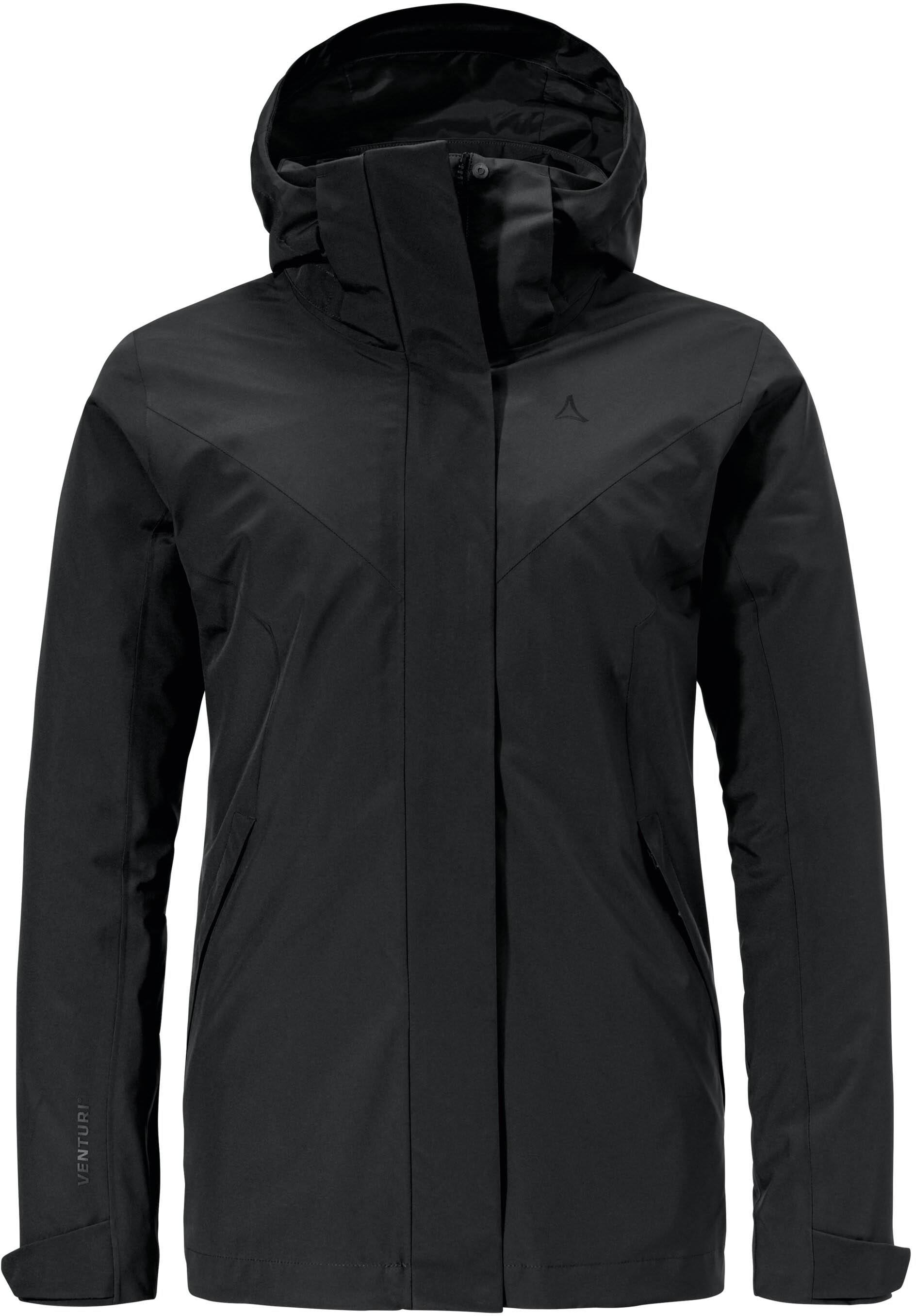 Praktische Doppeljacke für Damen, ideal zum Wandern; Außenjacke mit wasserdichter und atmungsaktiver Venturi®-Membran; vollständig versiegelte Nähte; 4-Wege-Stretch; 2-fach verstellbare Kapuze; verdeckter Frontreißverschluss; seitliche Eingrifftaschen mit Reißverschluss; Ärmelabschlüsse mit Klettriegeln; herauszippbare, wattierte Innenjacke, kann auch separat getragen werden; leicht taillierter Schnitt; normale Passform; mit Recyclingmaterial hergestellt; Wassersäule: 10.000 mm; Material 100% Polyester.
