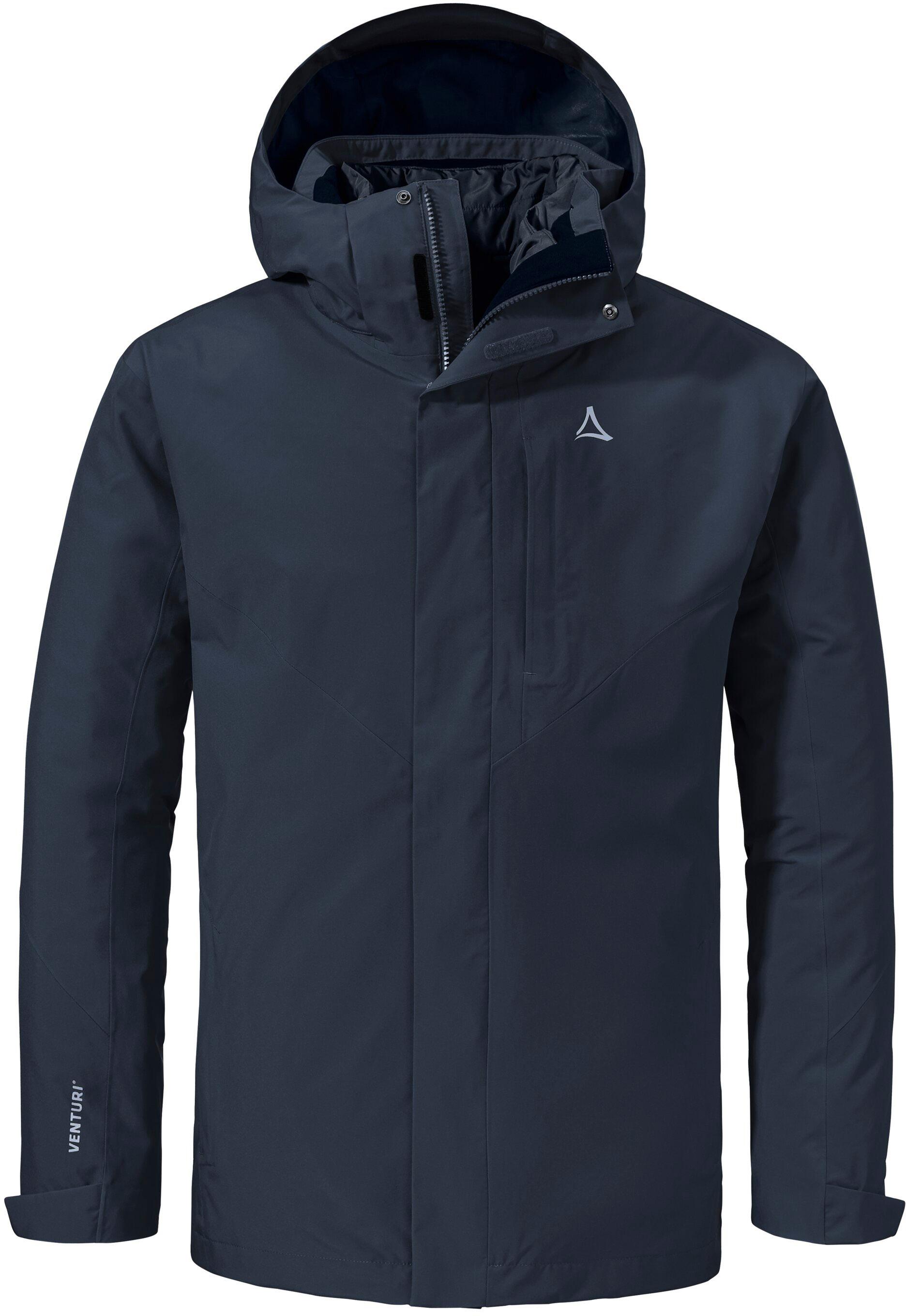 Doppeljacke aus wetterfester Außenjacke und wärmender Innenjacke; zweilagiges Material mit Venturi®-Membran; winddicht, wasserdicht und atmungsaktiv; Wassersäule: 10.000 mm; 4-Wege-Stretch; robustes, wärmeisolierendes Ventloft®-Material, speichert Körperwärme auch bei Nässe; verstellbare Kapuze; durchgehender Frontreißverschluss; Brusttasche und 2 Seitentaschen; Ärmelabschlüsse mit Klettriegeln und Saum mit Kordelzug verstellbar; Obermaterial 100% Polyester (recycelt); Futter I 100% Polyester; Futter II 100% Polyester.