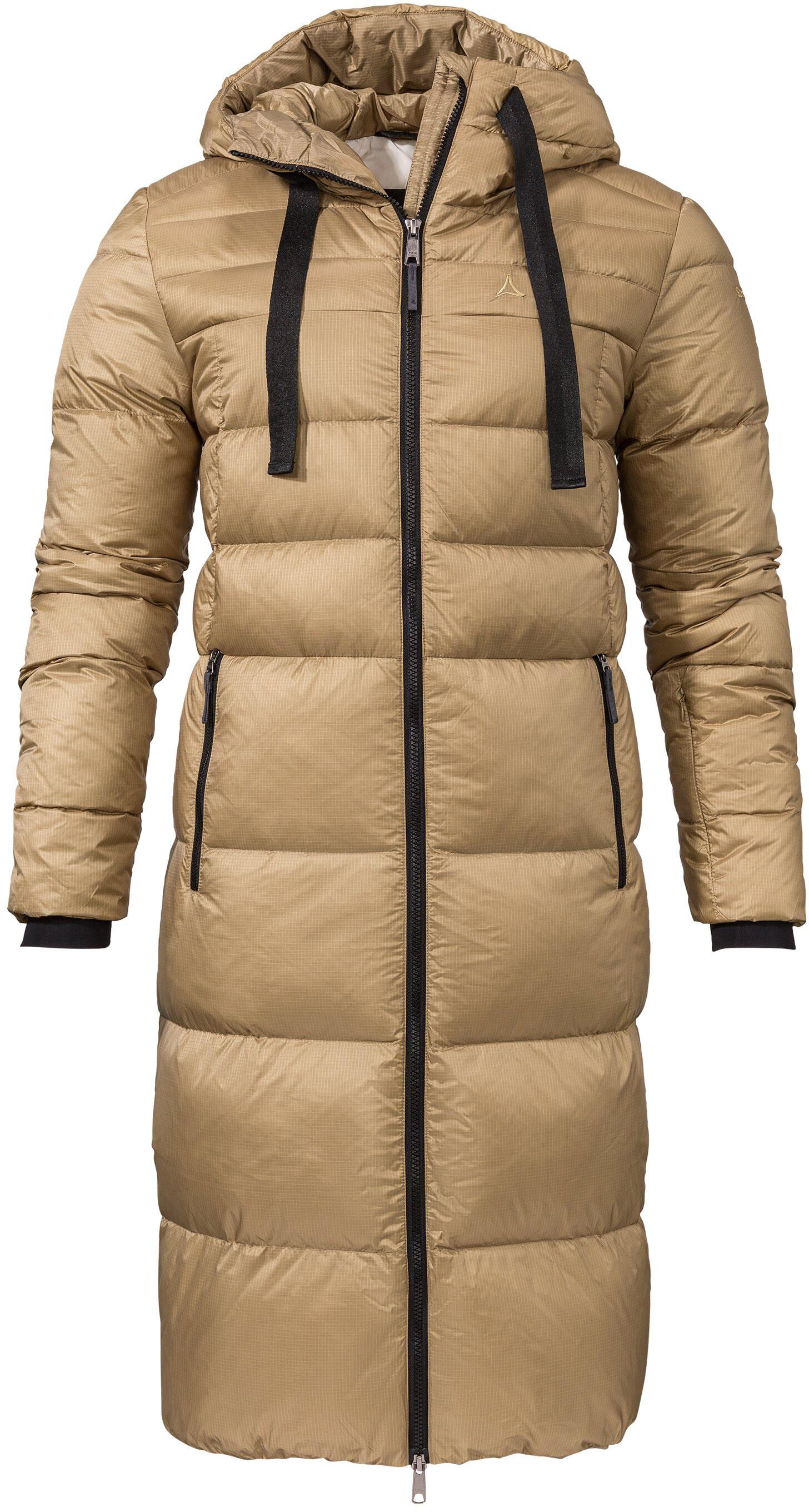 Gesteppter Mantel mit warmer Daunenisolierung; feste Kapuze mit breitem Kordelzug; Kinnschutz am Wärmekragen; unterlegter 2-Wege-Frontreißverschluss; 2 Reißverschlusstaschen; elastische Ärmelabschlüsse mit integrierten Cuffs; Seitenschlitze für mehr Bewegungsfreiheit; reflektierende Elemente; extrem leicht; winddicht; strapazierfähig; dauerhaft wasserabweisendes, ohne PFC hergestelltes Finish; enthält nichttextile Teile tierischen Ursprungs; bluesign® product; die Schöffel Outleisure Kollektion steht für urbane, stadtnahe Looks und beste Funktion; Rückenlänge bei Größe 38 ca 104 cm; Material 100% Polyamid.