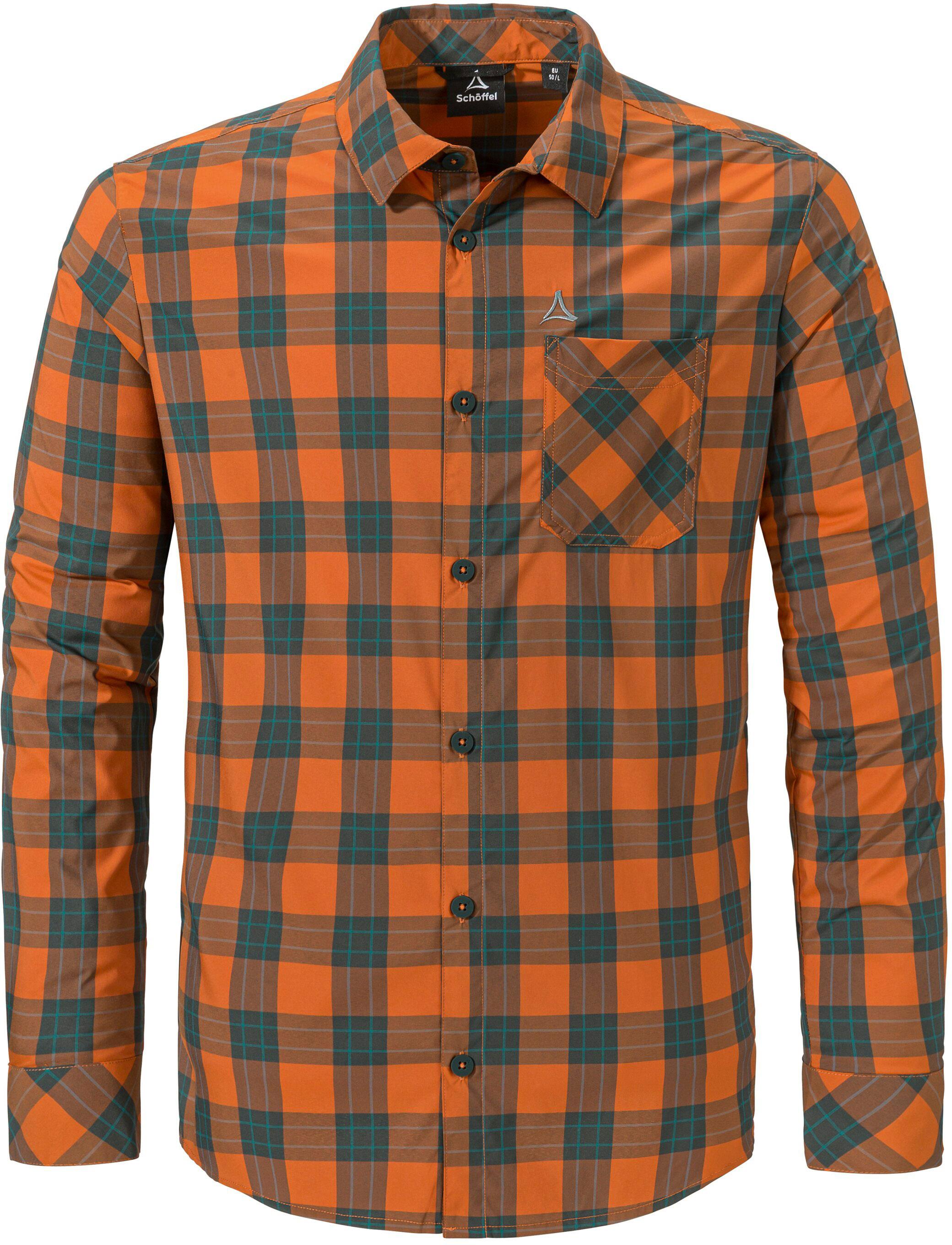 Langärmliges Wanderhemd mit Karomuster; bewegungsfreundliches 2-Wege-Stretchmaterial; leicht und weich; trocknet sehr schnell; mit Hemdkragen und Knopfleiste; offene Brusttasche; Ärmelabschlüsse mit Knopfleiste und Sportmanschetten; die Schöffel Outleisure Kollektion steht für urbane, stadtnahe Looks und beste Funktion; Material 92% Polyamid, 8% Elastan.