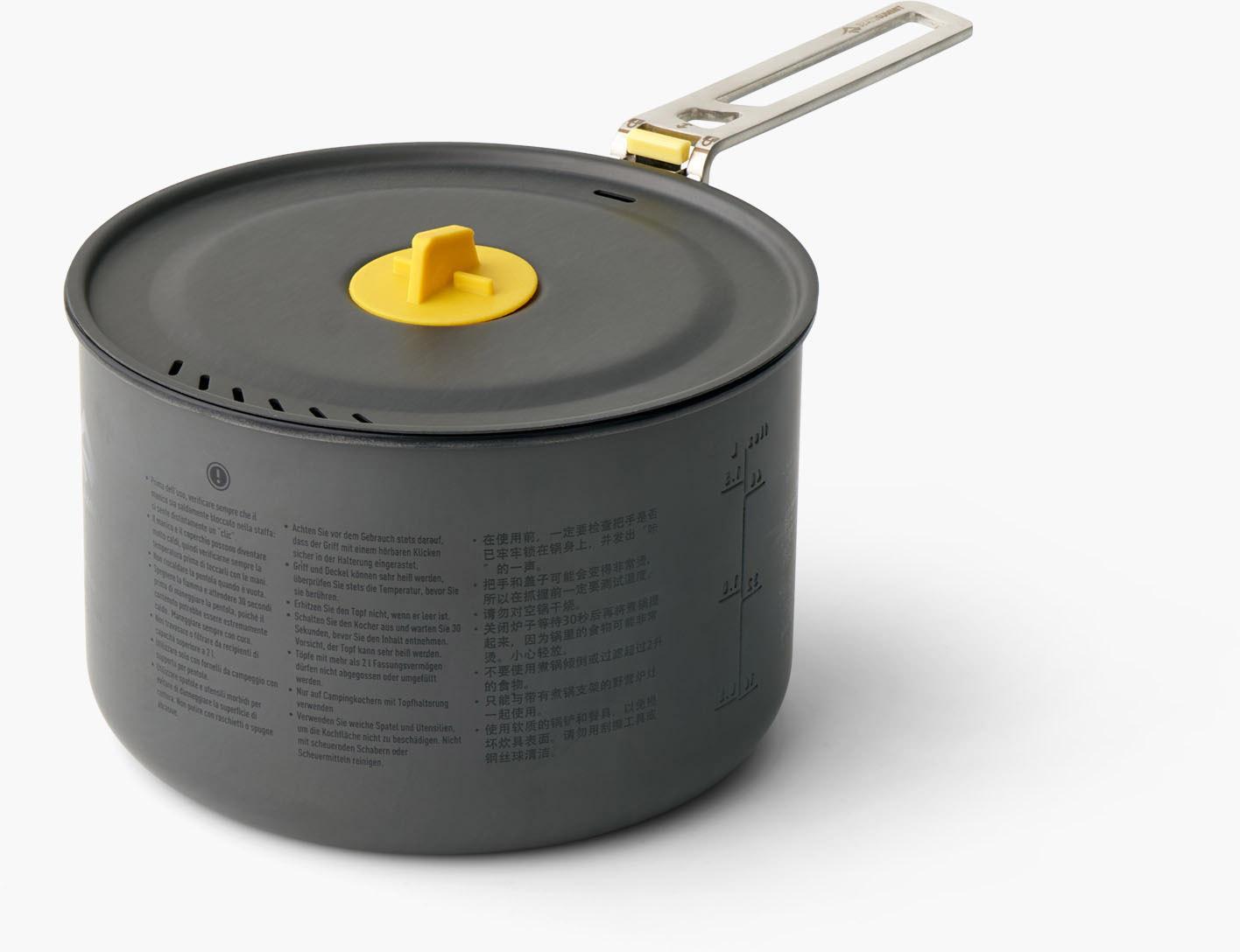 Campingtopf mit Deckel im leichtgewichtigen Design; aus einer langlebigen, harteloxierten Aluminiumlegierung; Antihaft-Oberfläche mit abriebfester Keramikbeschichtung; abnehmbarer Edelstahlgriff kann für platzsparendes Verstauen über den Deckel geklappt werden; Deckel mit integriertem Sieb; Lid Keep aus Silikon hält den Deckel an der Seite des Topfes; Volumenskala an der Topfinnenseite; Volumen: 2 l; Maße (L/B/H): ca. 30,1 x 16,5 x 11,2 cm; Gewicht: ca. 255 g.