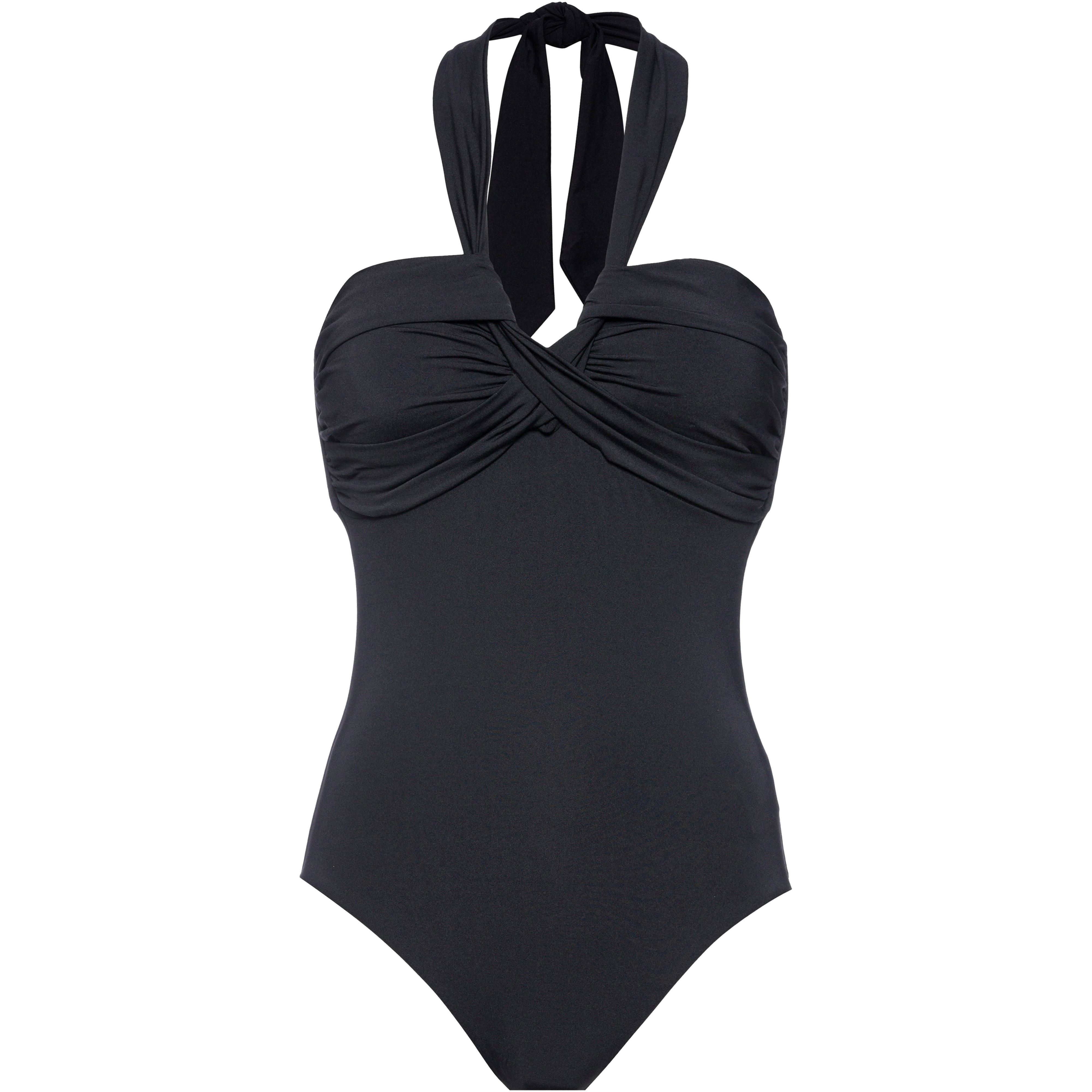 Badeanzug mit Neckholder Trägern; stylishes Bindesystem im Brustbereich, mit seitlicher Raffung; innenliegender Steg in V-Form in der vorderen Mitte; fest integrierte Softschalen sorgen für schöne Formgebung und guten Halt; Silikonstreifen am Dekolleté bietet optimalen Sitz; hohe Beinausschnitte; mit mindestens 80% Recyclingmaterial hergestellt; Material I 82% Polyamid recycelt), 18% Elastan, Material II 88% Polyamid (recycelt), 12% Elastan.