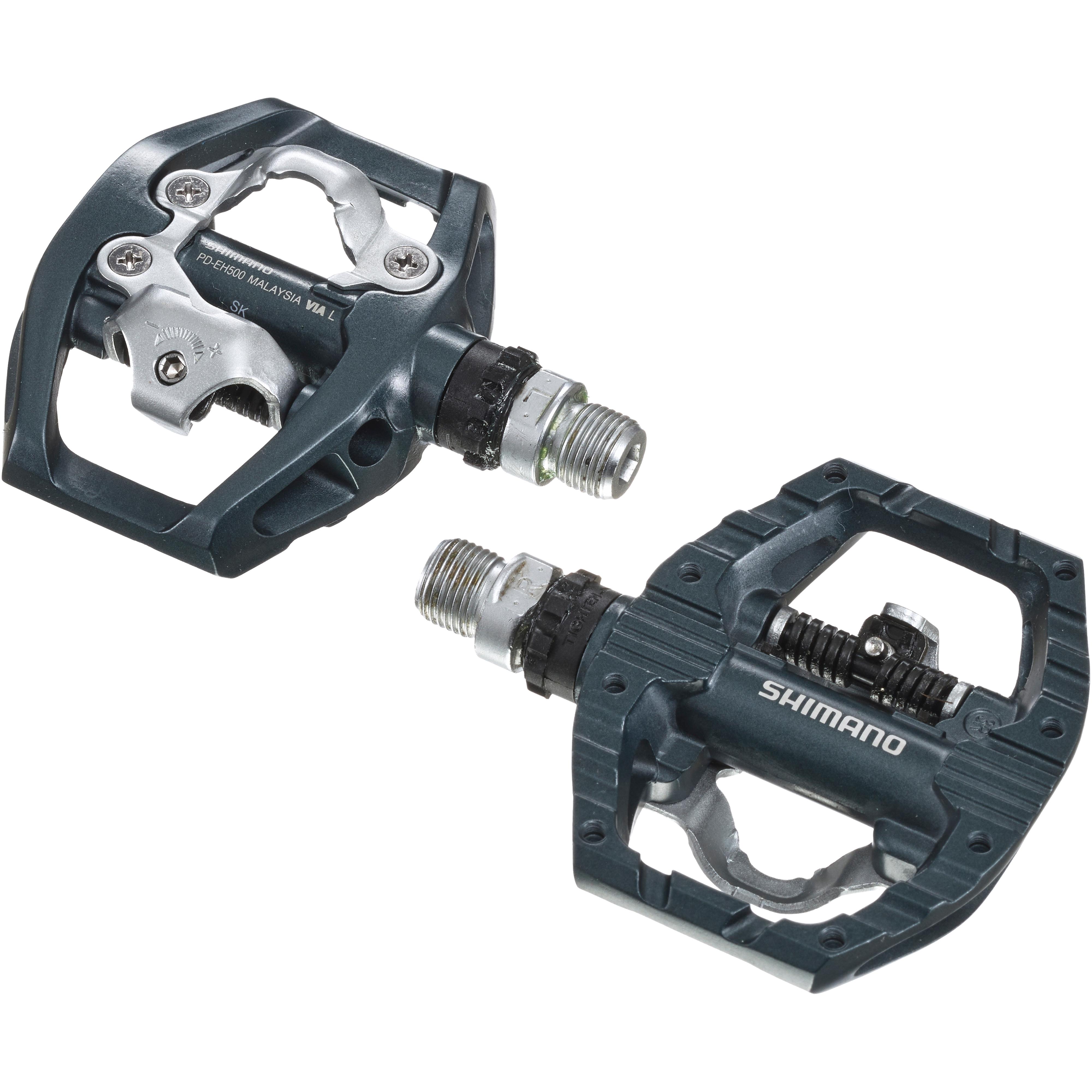 Shimano PD-EH500. 1 Paar Pedale mit SPD-Klicksystem auf der einen und griffige Plattform auf der anderen Pedalseite; aus robustem Aluminium; die Achseinheit mit gedichtetem Kompaktlager minimiert den Wartungsbedarf; einstellbare Ein- und Ausstiegshärte; matschabweisende Konstruktion; geeignet für Rennrad oder Fitnessbike; Gewicht: ca. 383 g (Paar).