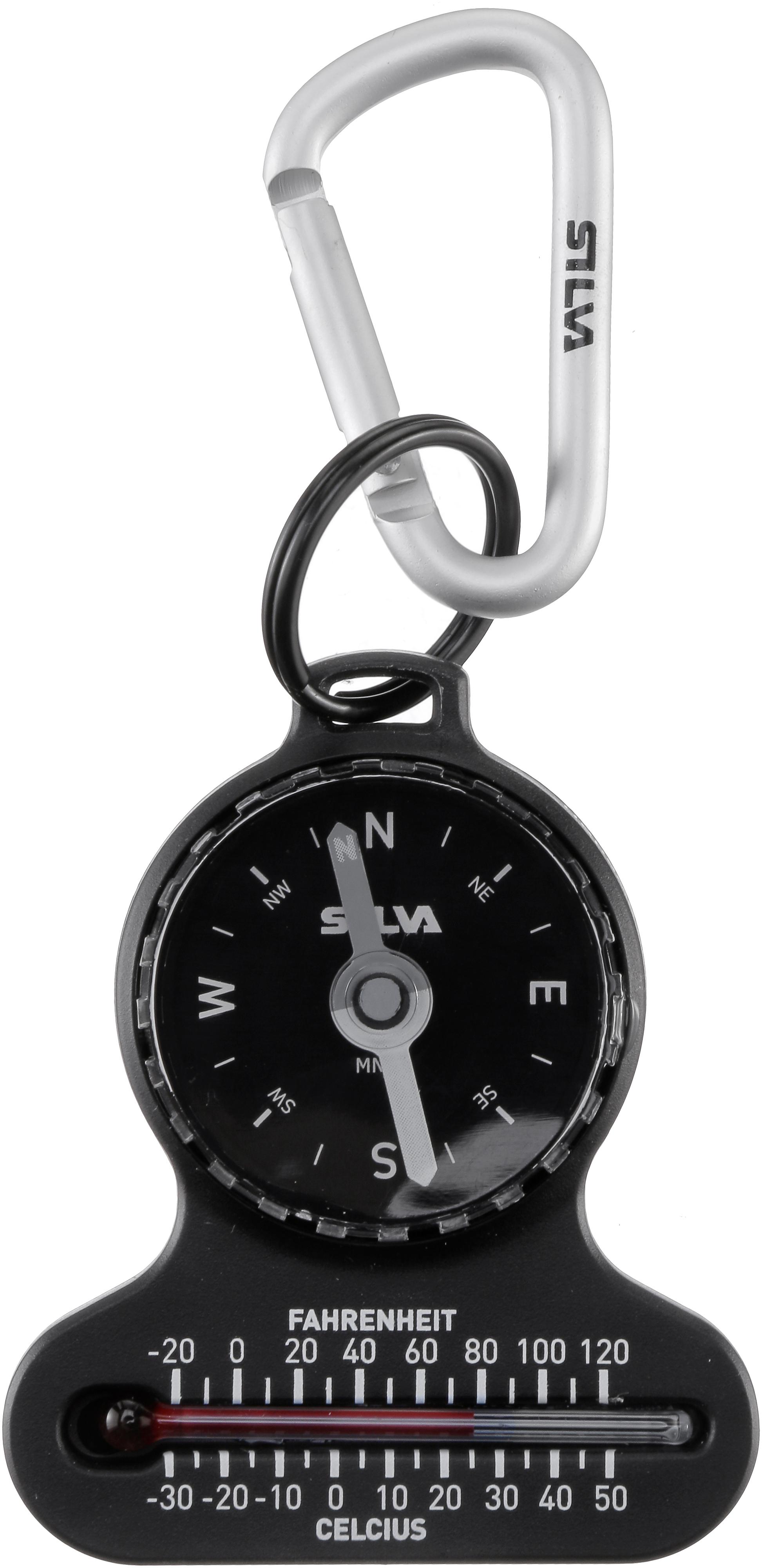 Kompass mit Karabiner und integriertem Thermometer; Maße: ca. 6 x 5 cm (H x B); Gewicht: ca. 15 g.