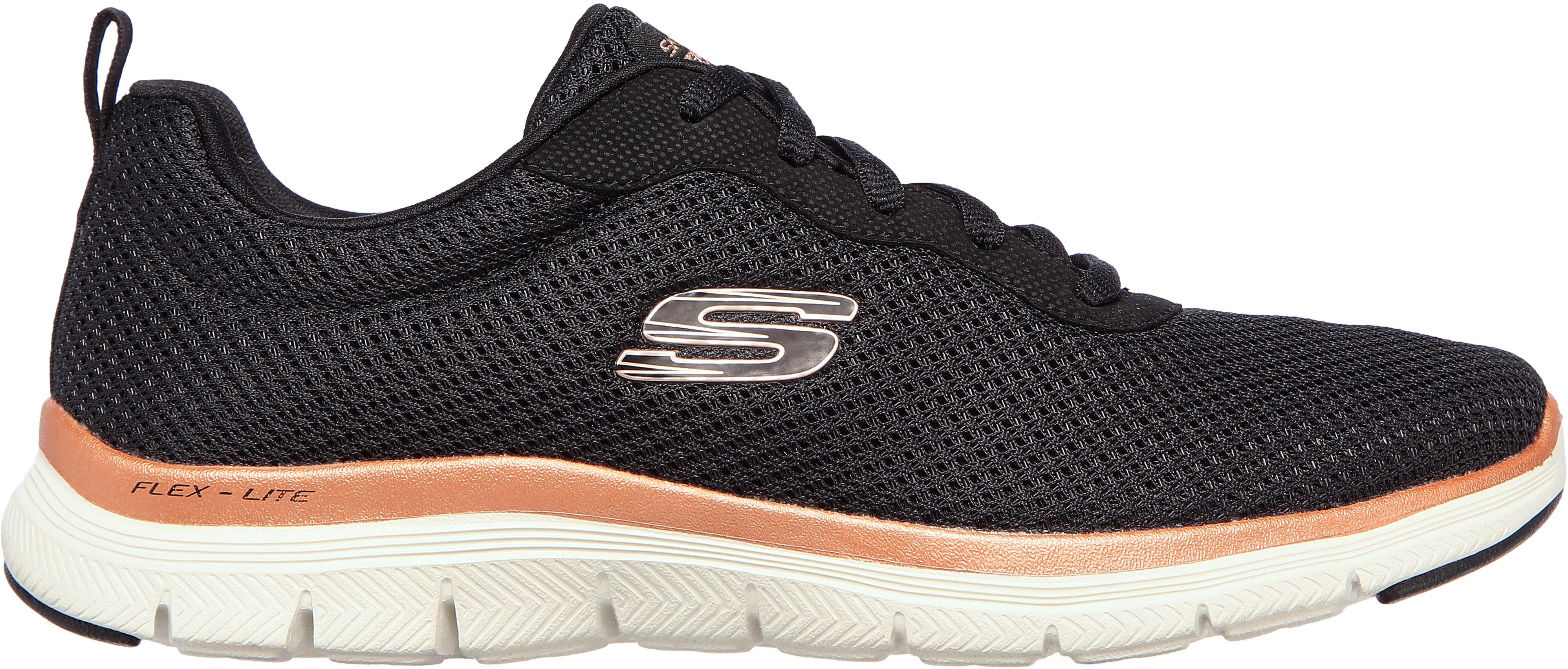 Leichte Sneakers für Damen mit stoßdämpfender Flex-Lite Zwischensohle; weiches, atmungsaktives Obermaterial aus Funktions-Mesh; Standard Schnürung; weicher Schaft mit Zuglasche; Textilfutter; gepolsterte Skechers Air-Cooled Memory Foam® Komfort-Einlegesohle; extrem flexible Traktionslaufsohle aus Gummi; Logodetail; waschmaschinenfest.