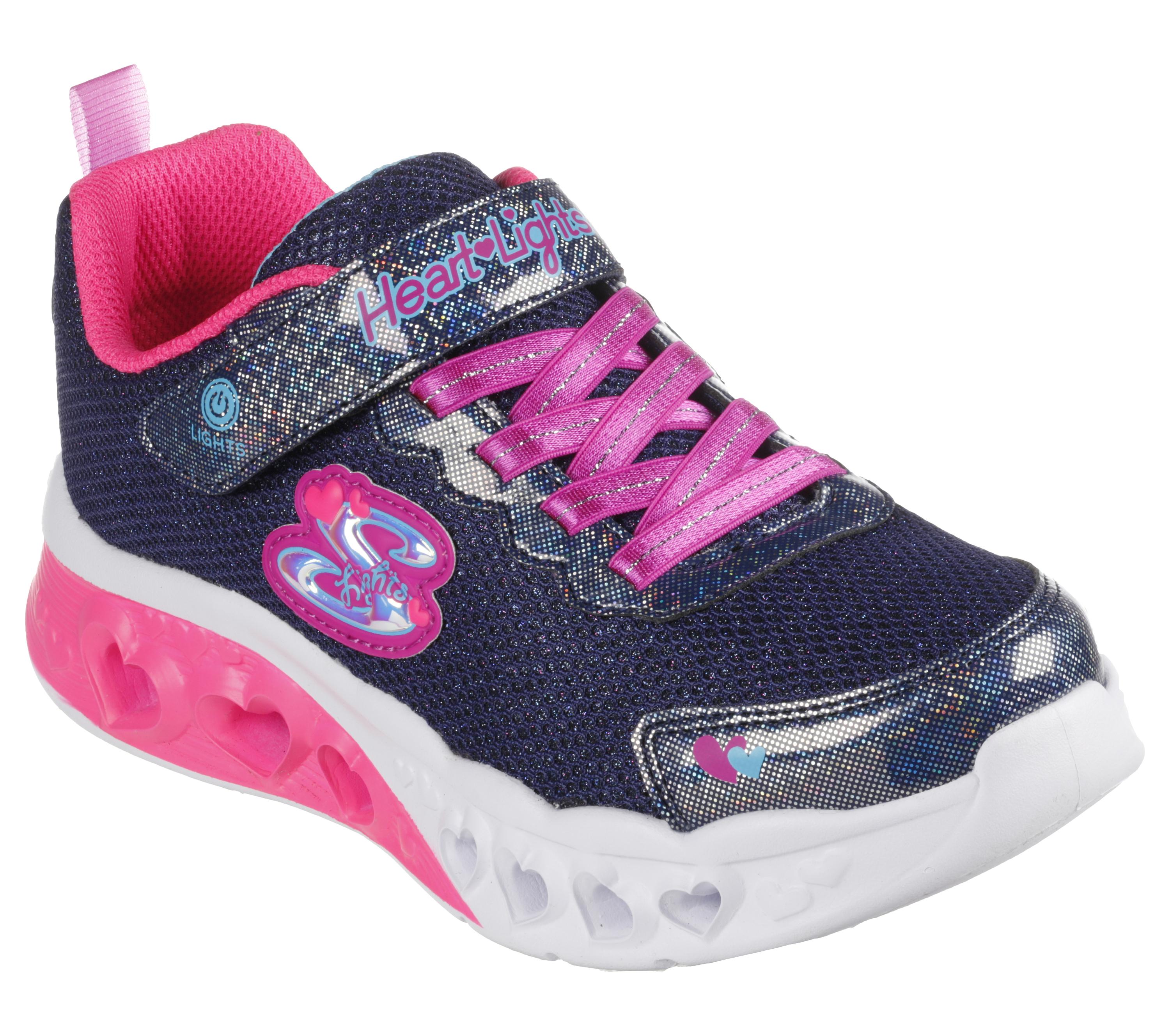 Der SKECHERS S-Lights: Flutter Heart Lights - Bring Sparkle ist ein leichter und bequemer Schuh mit einem glitzernden teilsynthetischen Obermaterial aus Meshgewebe. Die 3-D-Herz-Zwischensohle sorgt für eine lustige Optik und ist beleuchtet. Die die süßen Lichter und die hübschen Farben machen den Tag noch schöner.
