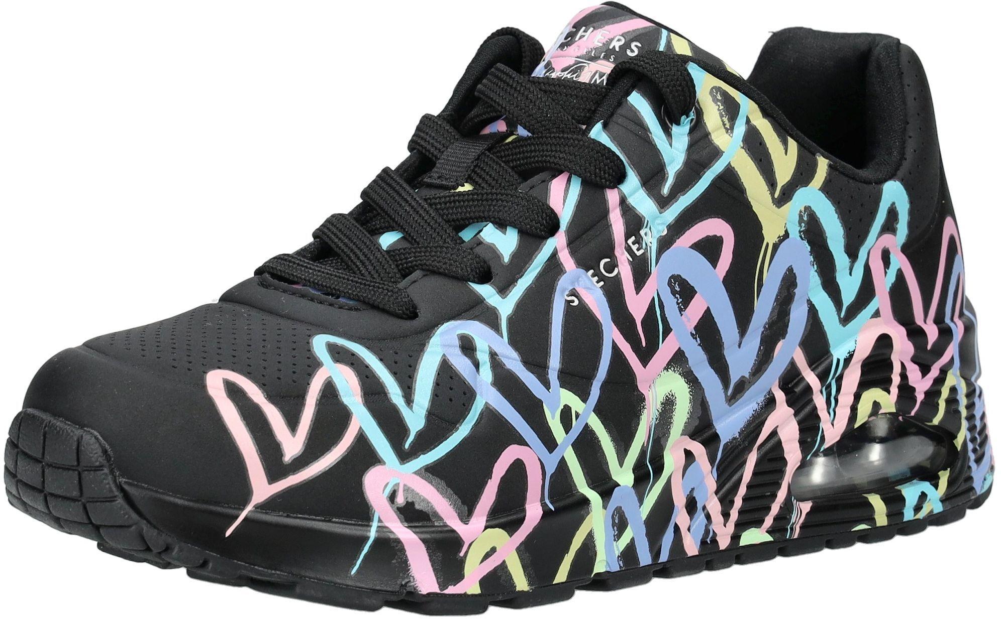 Ein cooler Low Sneaker von Skechers aus Lederimitat. Ein auffälliger Herzprint" macht diesen Sneaker zu einem absoluten Hingucker. Die ultraweiche Textildecksohle sorgt für einen guten Komfort bei jedem Schritt und kann bei Bedarf ausgewechselt werden. Obendrein ist die transparente Luftkammer im Bereich der Laufsohle für gute Stoßdämpfung und ist zudem ein echtes Design Highlight. "