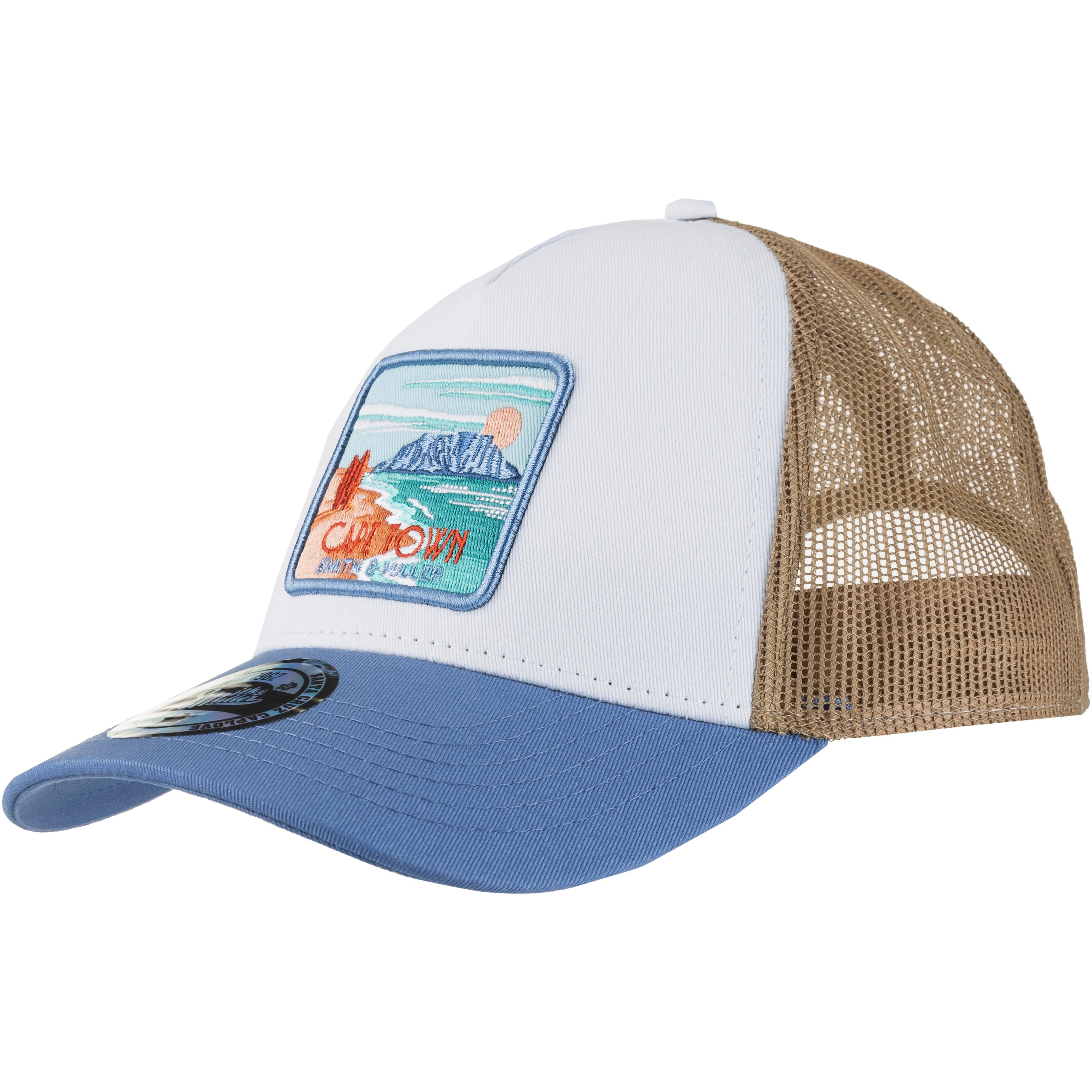 Trucker-Cap mit Mesh-Rückseite; gesticktes Malibu-Logo-Badge auf der Vorderseite; 5-Panel-Design mit verstärkter Krone und gebogenem Schirm; verstellbarer Snapback-Verschluss; Material I 100% Baumwolle, Material II 100% Polyester.
