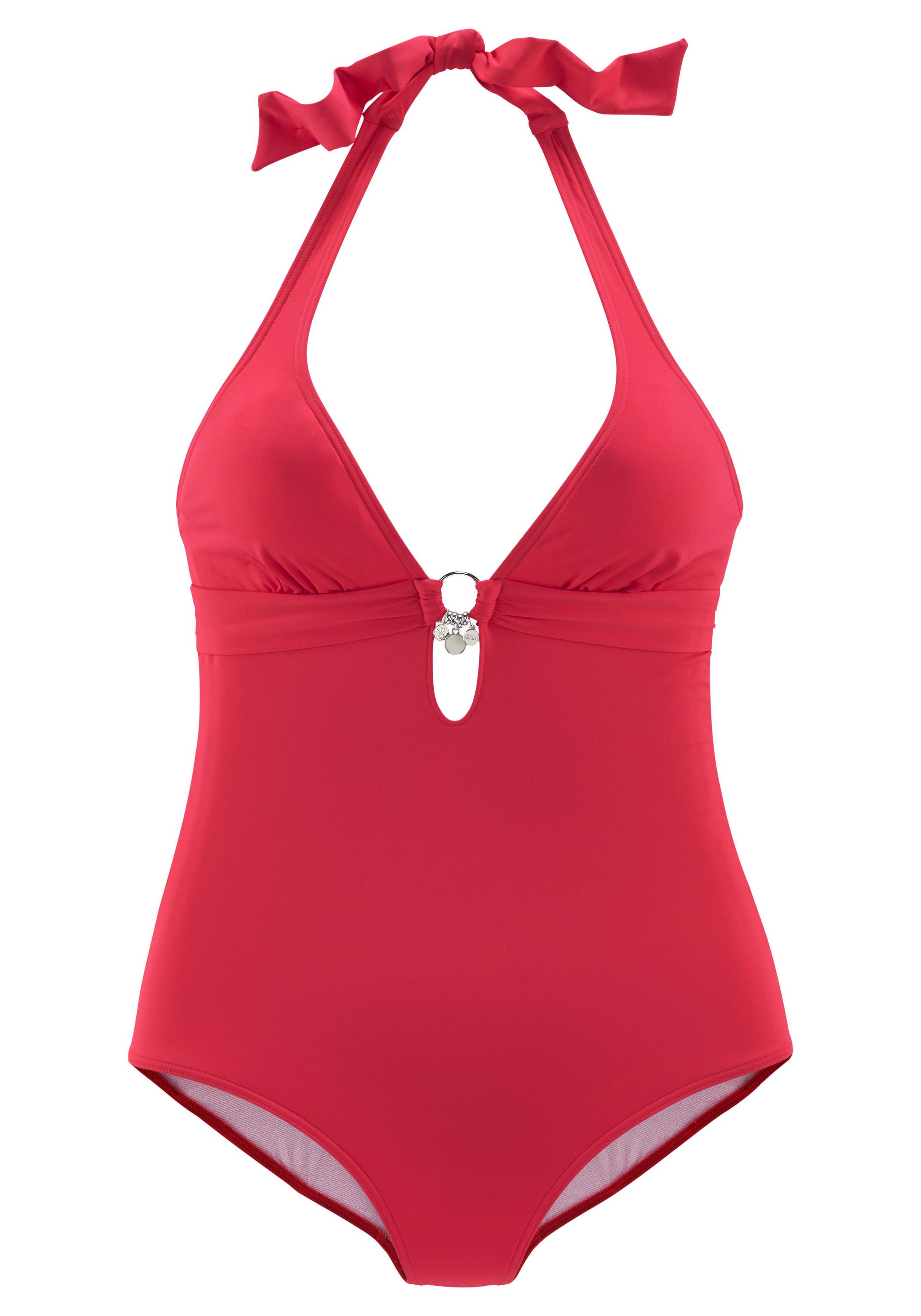 Bademoden von s.Oliver RED LABEL Beachwear mit silberfarbenen Accessoires als besonderes Trend-Detail. Badeanzug mit Accessoires zwischen den Cups, darunter mit raffinierter Öffnung. Herausnehmbare Cups, im Nacken zu binden und im Rücken zu schließen. Vorn gefüttert. Softe Microfaser.