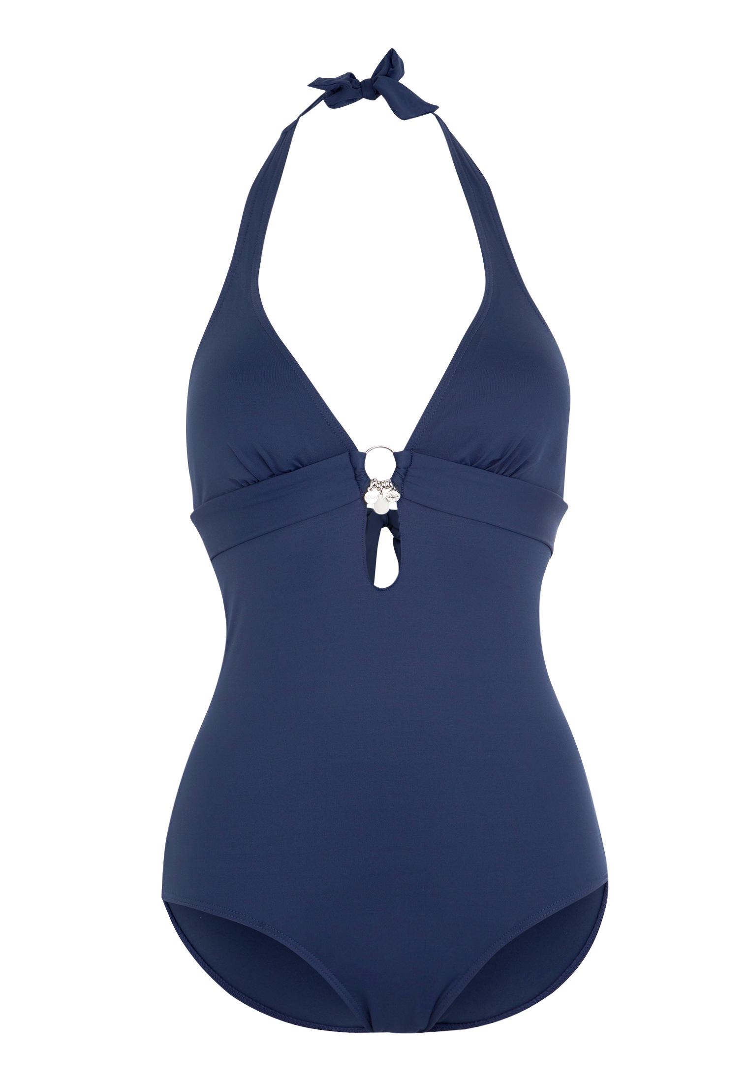 Bademoden von s.Oliver RED LABEL Beachwear mit silberfarbenen Accessoires als besonderes Trend-Detail. Badeanzug mit Accessoires zwischen den Cups, darunter mit raffinierter Öffnung. Herausnehmbare Cups, im Nacken zu binden und im Rücken zu schließen. Vorn gefüttert. Softe Microfaser.