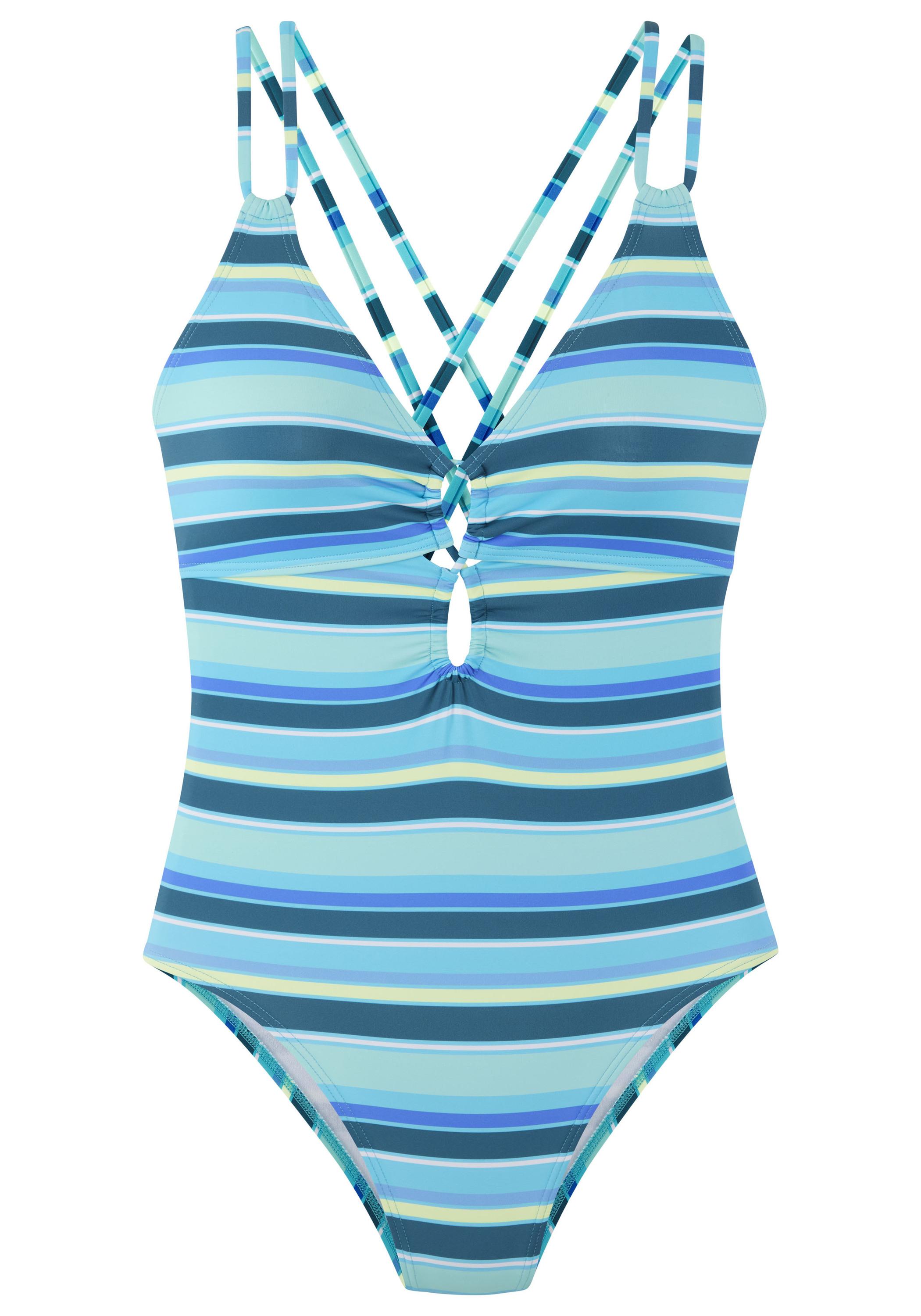 Badeanzug von s.Oliver mit sommerlichem Streifenmuster. Reizende Cut-outs. Doppelte Trägergestaltung, im Rücken gekreuzt. Herausnehmbare Softcups. Klassische Passform. Der Materialmix enthält recyceltes Polyamid.