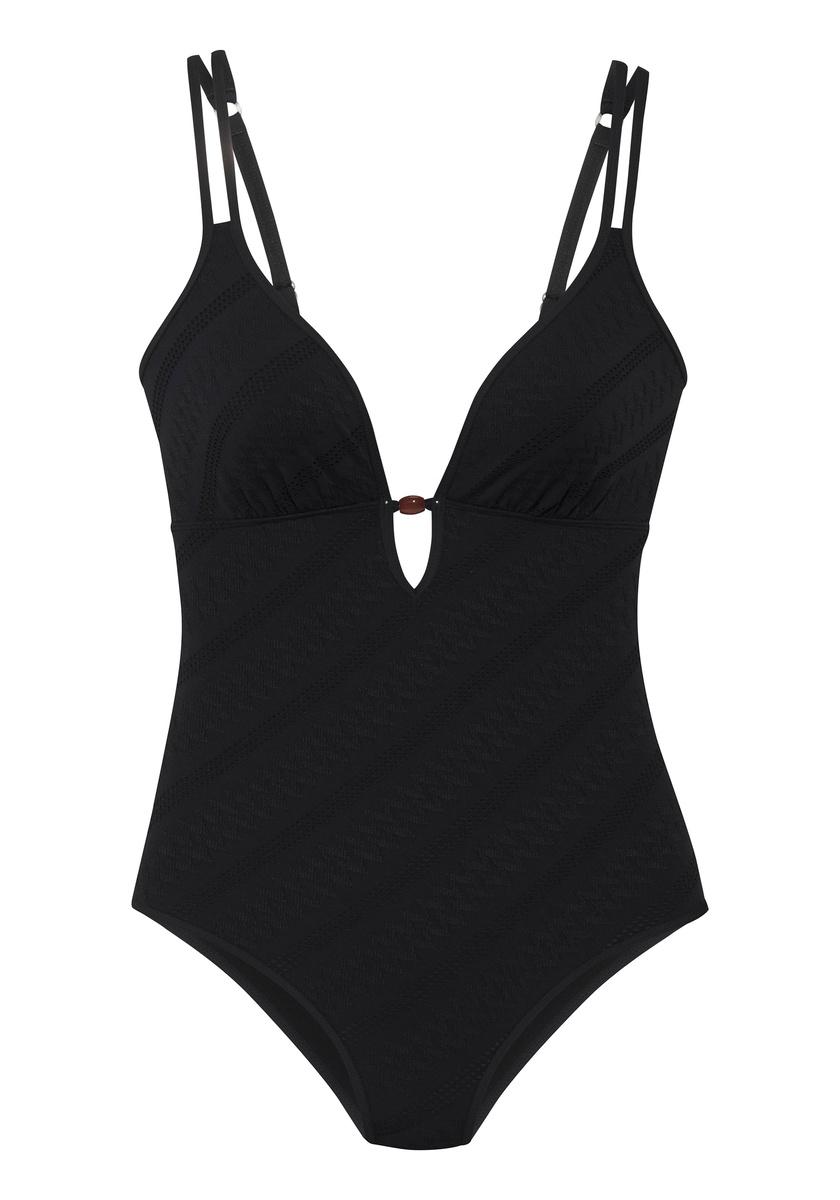 Badeanzug von s.Oliver. Unifarben. Tiefer Ausschnitt mit Zierperlen zwischen den Cups. Verstellbare Doppelträger. Elegante Strukturware.