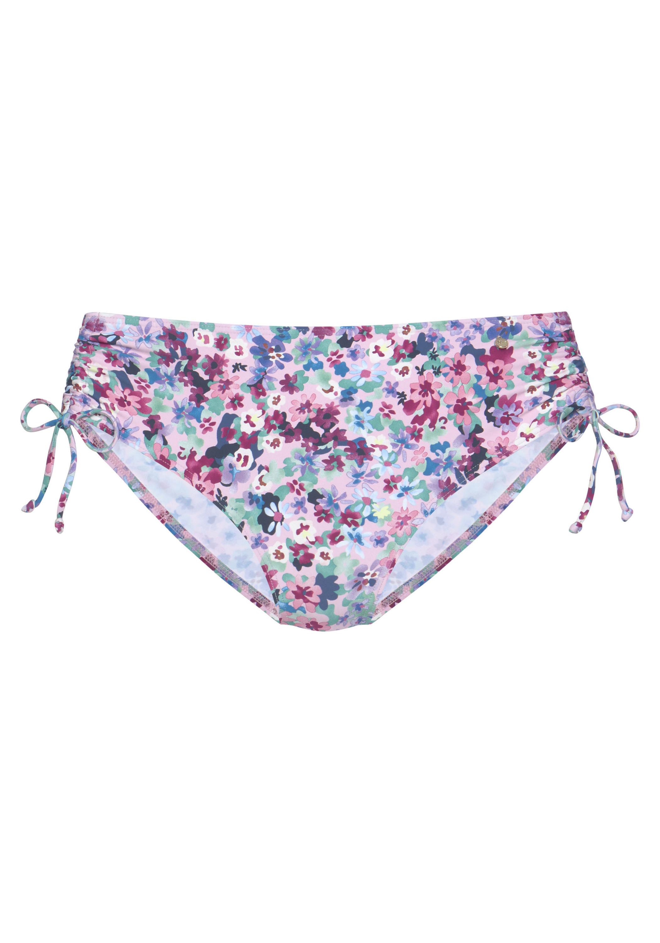 Bikini-Hose von s.Oliver mit hübschem Blumenprint. Beinausschnitte höher geschnitten und mittels Bindebändern individuell zu regulieren. Nach Lust und Laune kombinierbar. Elastisches Material.