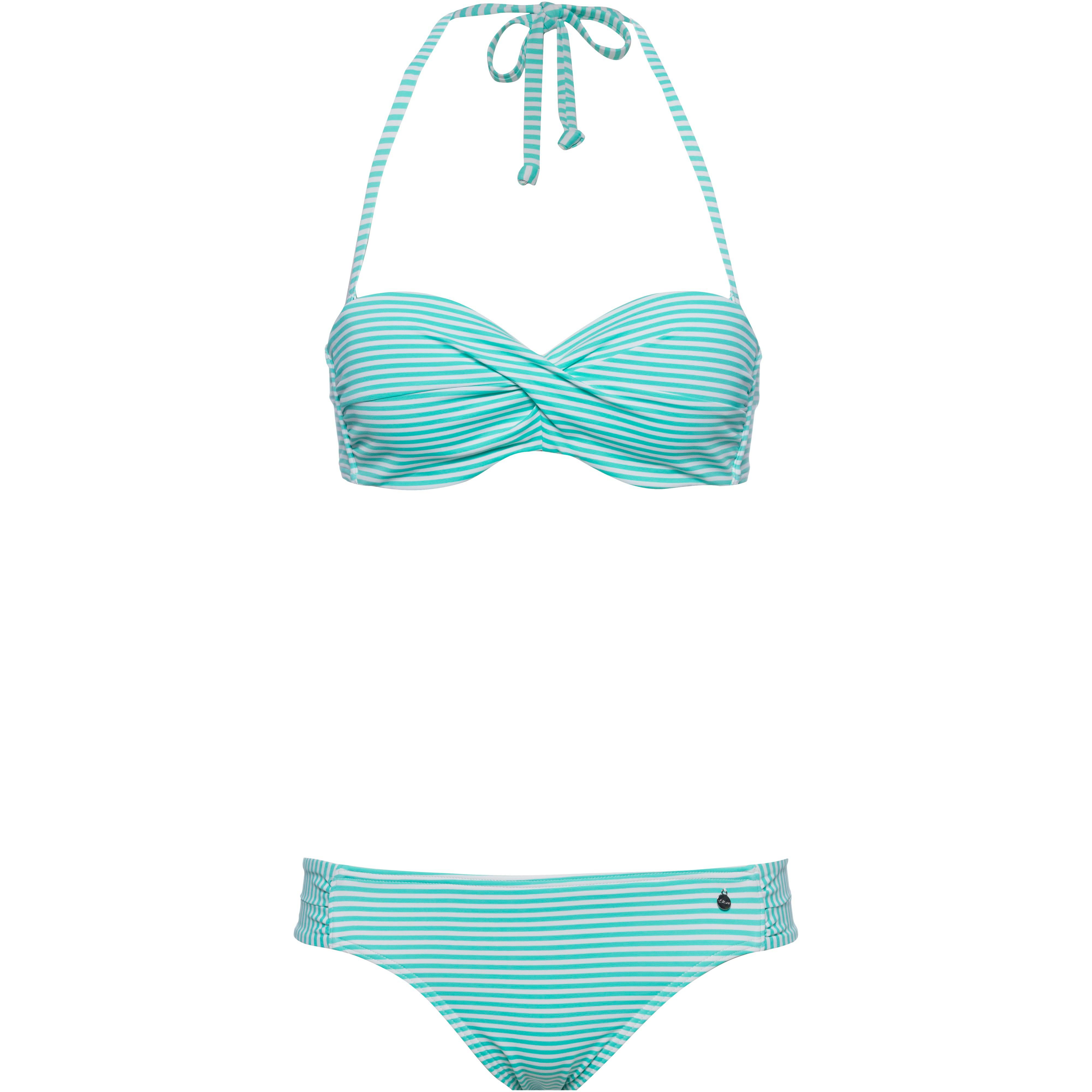 Bikini Set im maritimen Streifendesign; Bikini Oberteil in Bandeau Passform, mit Bügel; abnehmbare Neckholder Träger zum Binden; Raffung in der vorderen Mitte sowie an den Seiten; integrierte, seitliche Stäbchen für optimale Formgebung; Klick-Verschluss im Rückenbereich; wattierte Cups mit zusätzlichen, herausnehmbaren Kissen für einen Push-up Effekt; Bikini Hose in Slip Passform; seitliche Bänder; Material I 84% Polyamid, 16% Elastan, Material II 92% Polyester, 8% Elastan.
