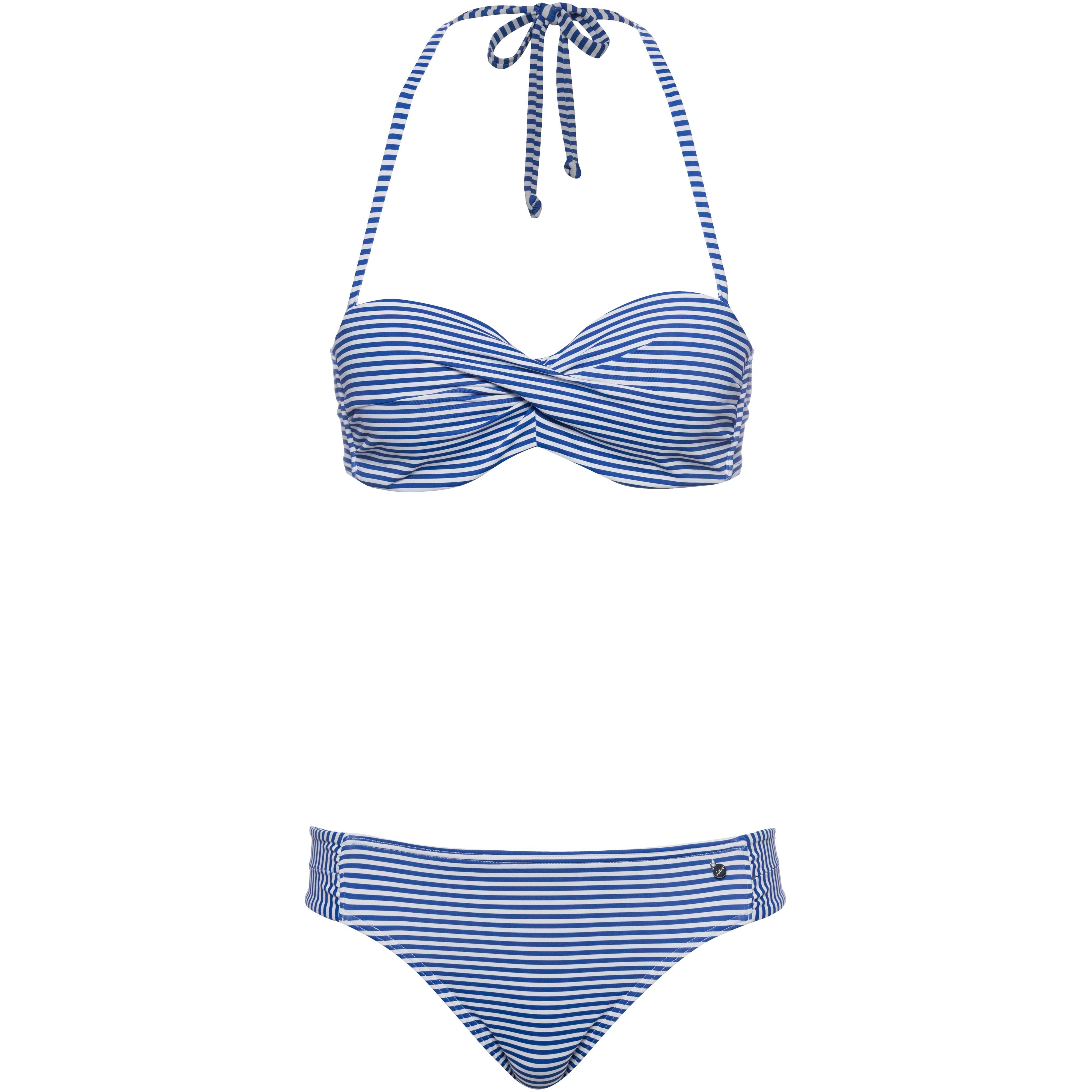 Bikini Set im maritimen Streifendesign; Bikini Oberteil in Bandeau Passform, mit Bügel; abnehmbare Neckholder Träger zum Binden; Raffung in der vorderen Mitte sowie an den Seiten; integrierte, seitliche Stäbchen für optimale Formgebung; Klick-Verschluss im Rückenbereich; wattierte Cups mit zusätzlichen, herausnehmbaren Kissen für einen Push-up Effekt; Bikini Hose in Slip Passform; seitliche Bänder; Material I 84% Polyamid, 16% Elastan, Material II 92% Polyester, 8% Elastan.