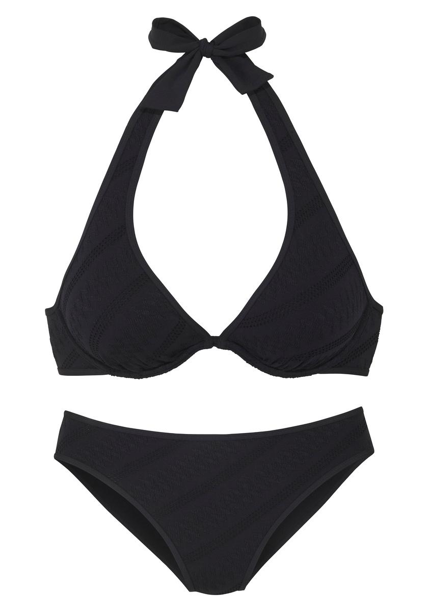 Bügel-Bikini von s.Oliver. Unifarbenes Design. Neckholder-Top mit herausnehmbaren Softcups. Hose klassisch geschnitten. Elegante Strukturware.