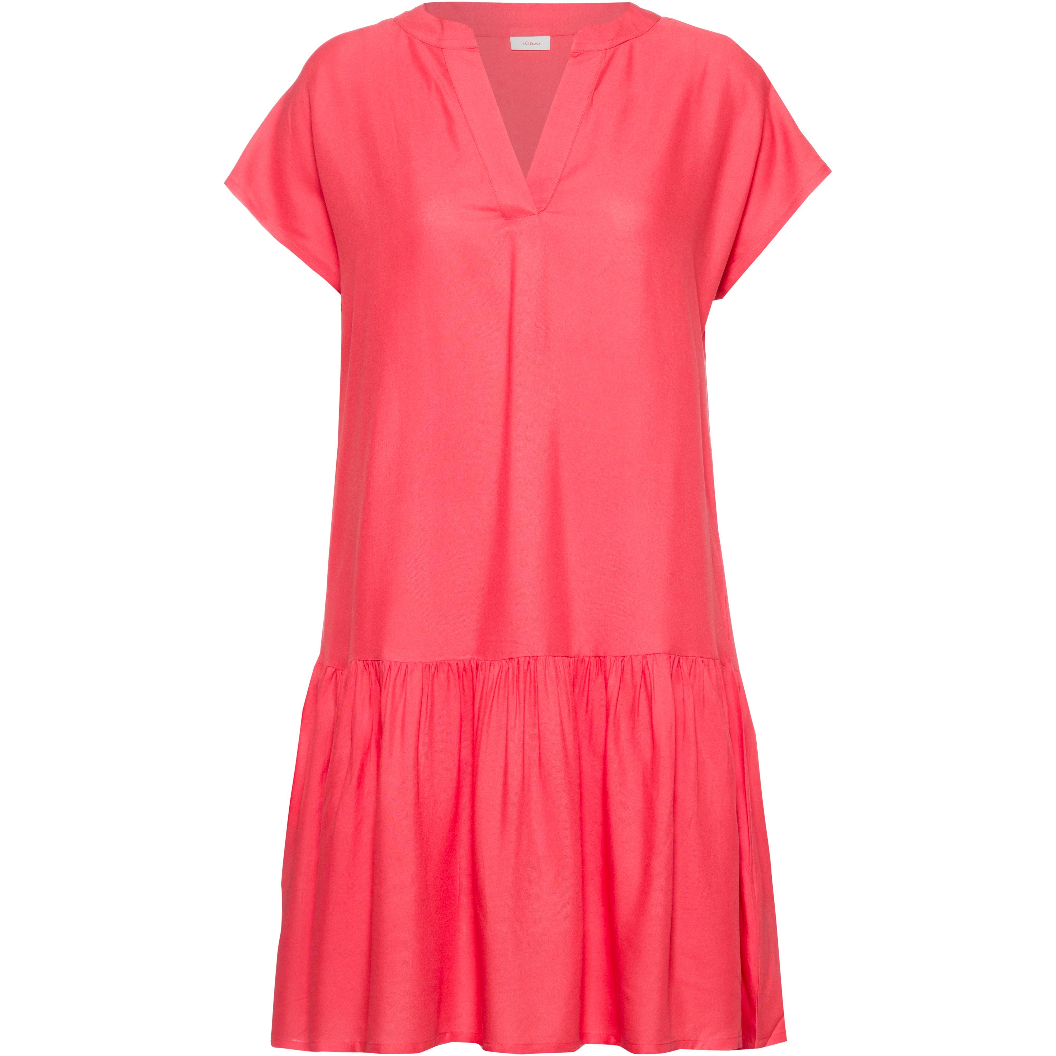 Kurzärmliges Kleid in luftiger Passform; V-Ausschnitt; überschnittene Schultern; Volantrock mit Raffungsdetails; flache, reibungsarme Nähte; Seitenlänge: ca. 93 cm/Gr. 36; Material 100% Viskose.