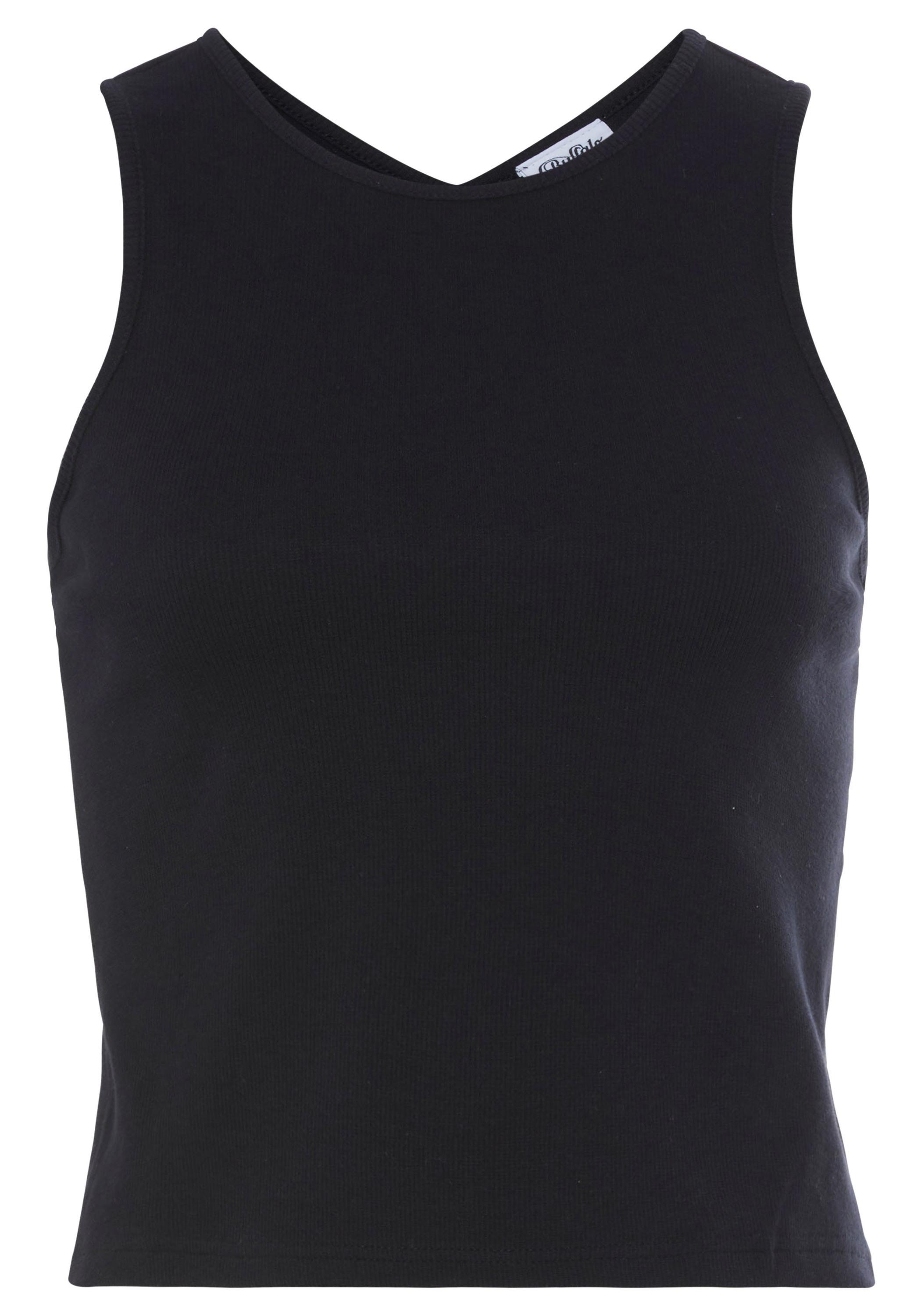 Sportliches Top von S.Oliver mit hohem Rundhalsausschnitt und modischem Rücken-Cut-out. Breite Träger. Körpernahe Passform mit geradem Saum. Weiche, elastische Baumwoll-Rippqualität.