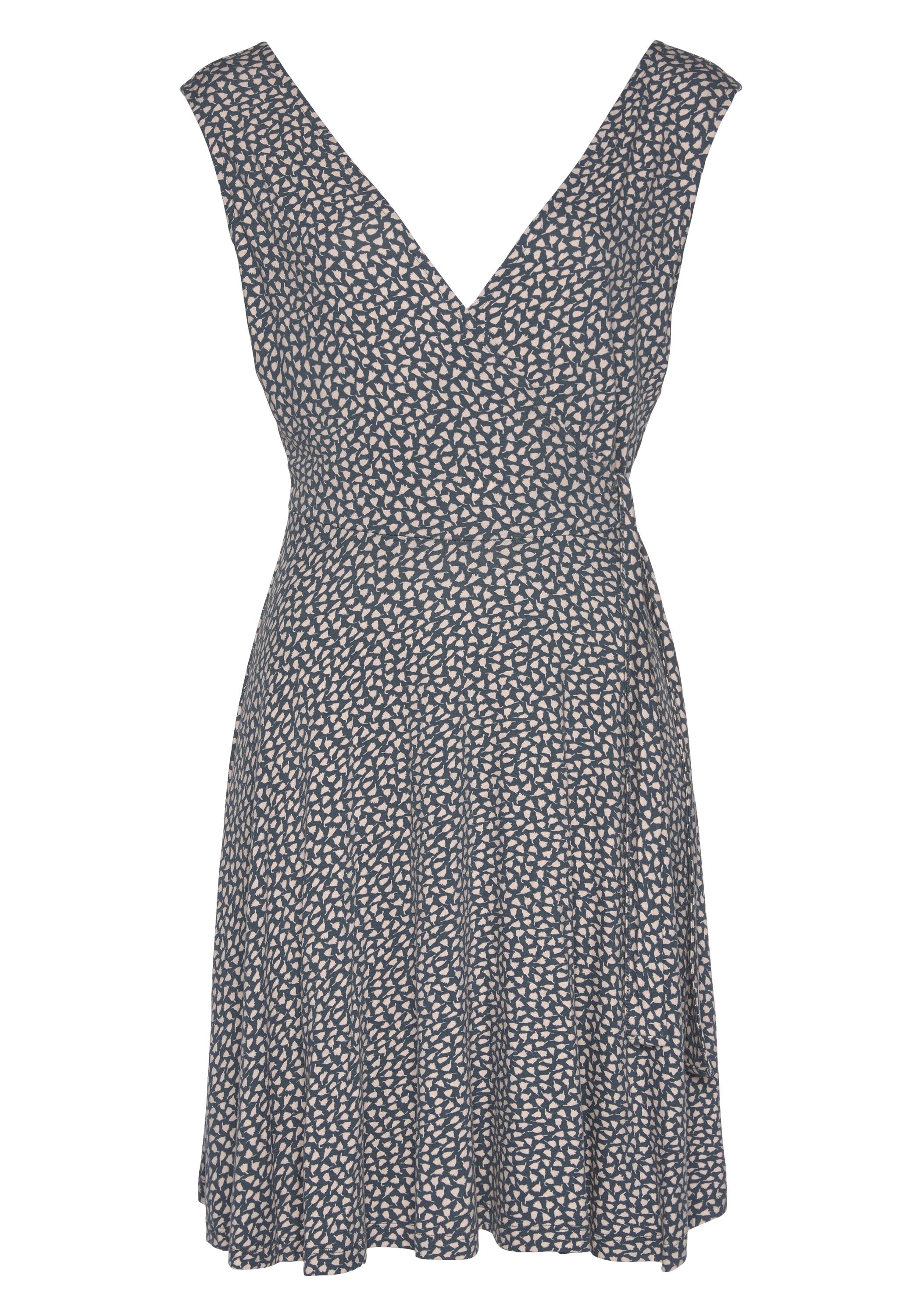 Strandkleid von s.Oliver Beachwear. Allover bedruckt, jedes Teil ein Unikat. Oberteil in überlappender Wickeloptik. Kurzer Rockpart. Rocklänge ca. 50 cm. Aus 95% Viskose, 5% Elasthan.