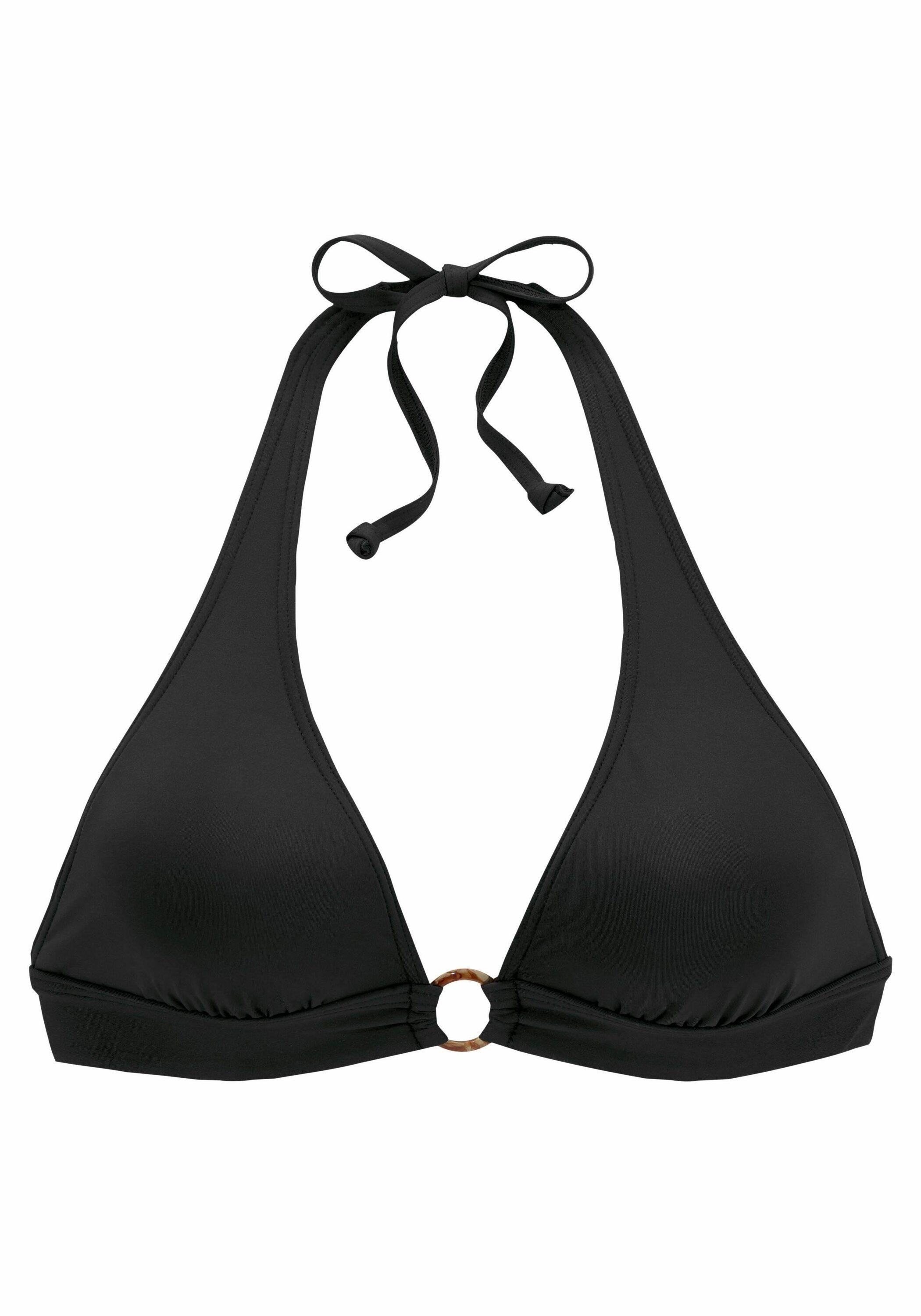 Triangel-Top von S.Oliver Beachwear mit herausnehmbaren Softcups. Zierring in Horn-Optik in der vorderen Mitte. Obermaterial: 84% Polyamid, 16% Elasthan. Futter: 100% Polyamid