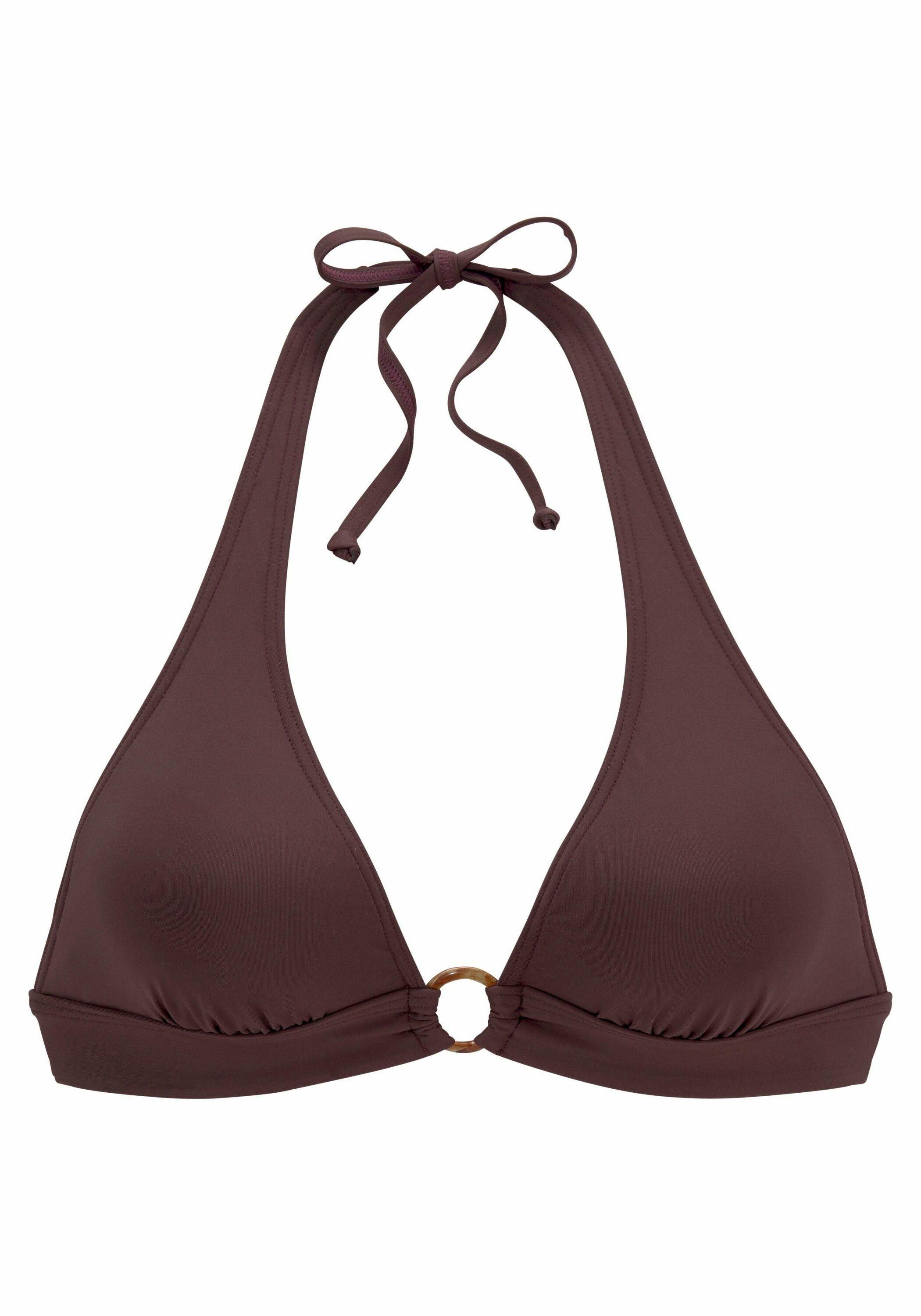 Triangel-Top von S.Oliver Beachwear mit herausnehmbaren Softcups. Zierring in Horn-Optik in der vorderen Mitte. Obermaterial: 84% Polyamid, 16% Elasthan. Futter: 100% Polyamid