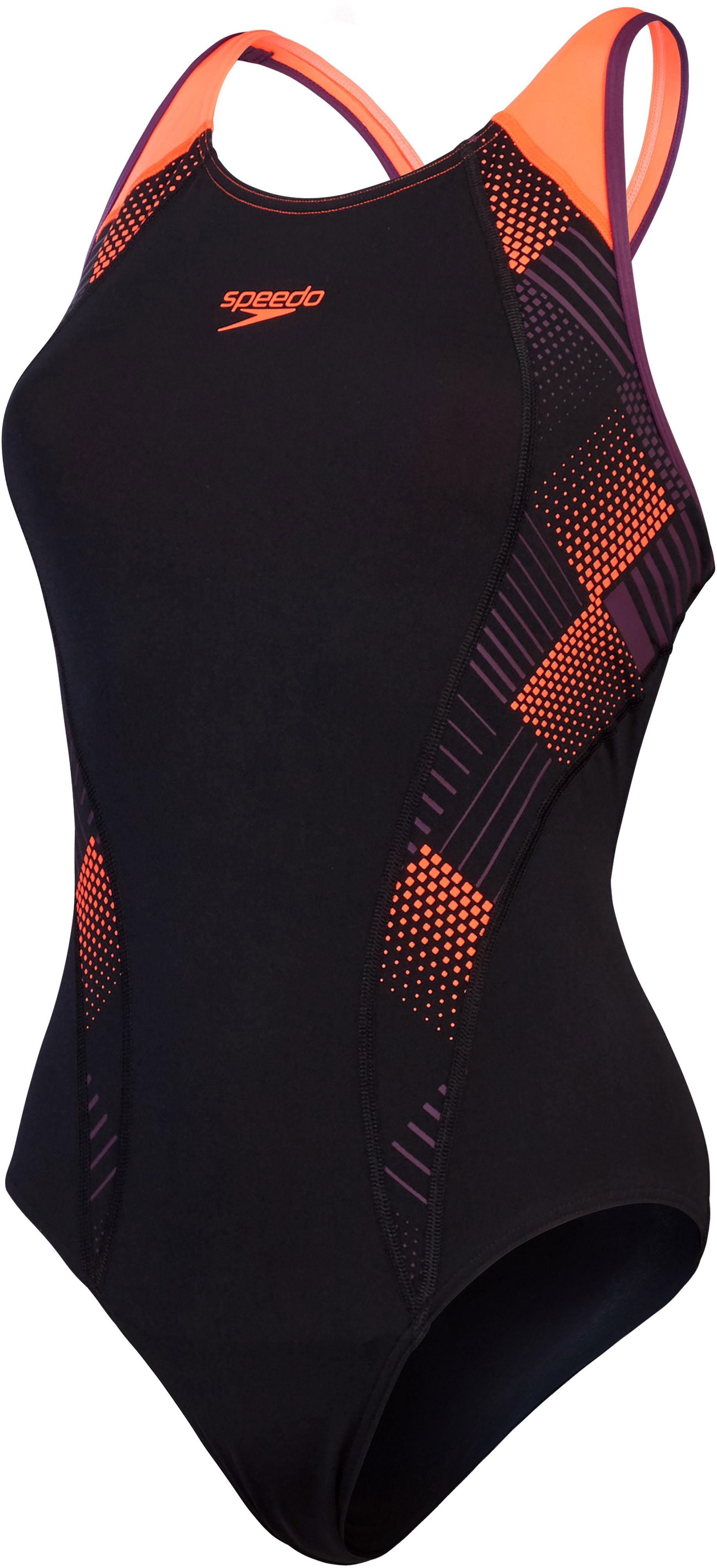 Strapazierfähiger Badeanzug aus schnelltrocknendem und chlorbeständigem ECO Endurance+ Max-Material; U-Ausschnitt; seitliche Einsätze mit dynamischem Grafikprint; stützendes Unterbrustband; kontrastierende Träger im Racerback-Design; großes, rundes Cut-out am Rücken; mittelhohe Beinausschnitte; mit Recyclingmaterial hergestellt; Material I 100% Polyester, Material II 100% Polyester.