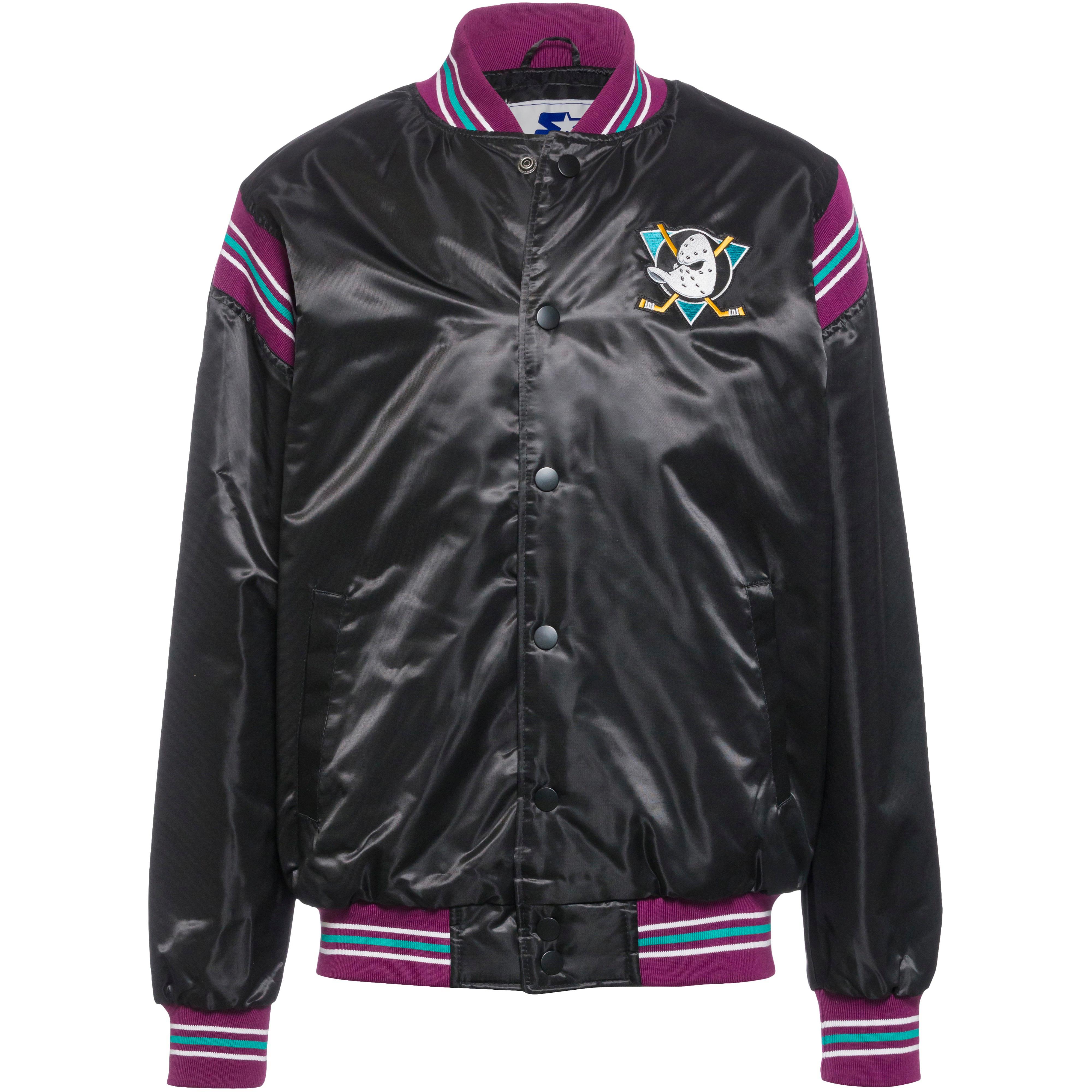 Schimmernde Polyjacke im Look einer Bomberjacke geschnitten, mit Vereinslogo der Anaheim Ducks auf der Front; Stehkragen sowie Arm-und Saumabschluss mit Rippbündchen; durchgehende Druckknopfleiste auf der Front; 2 seitliche Eingriffstaschen; 2 Innentaschen; Obermaterial 100% Polyester, Futter 100% Polyester, Wattierung 100% Polyester.