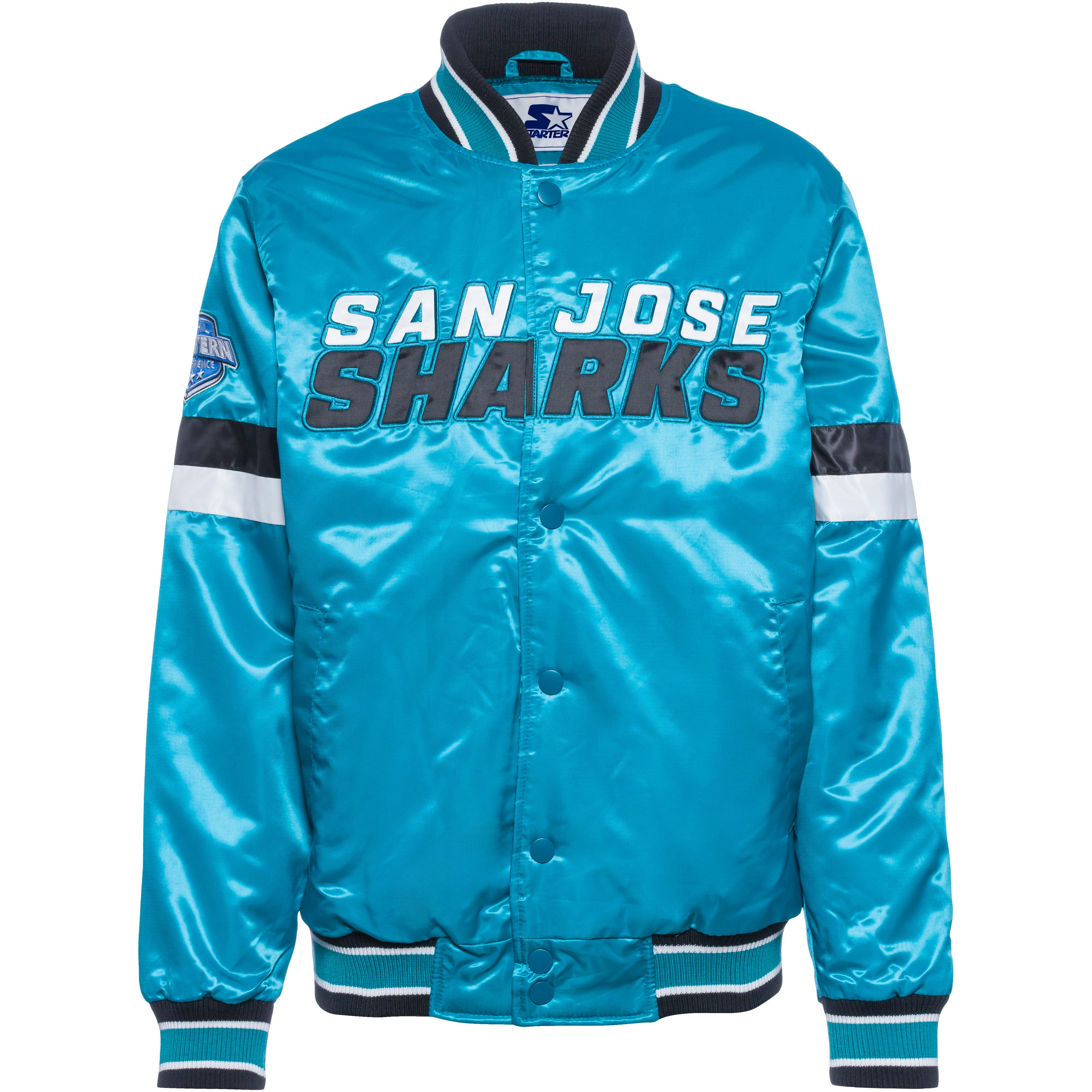 Gefütterte Polyjacke im Bomberjacken Look, mit Vereinsdetails von San Jose Sharks auf der Front und im Rückenbereich; Stehkragen sowie Arm-und Saumabschluss mit Rippbündchen; Druckknopfleiste auf der Front; 2 seitliche Eingriffstaschen; 2 Innentaschen; Obermaterial 100% Polyester, Futter 100% Polyester, Füllung 100% Polyester.