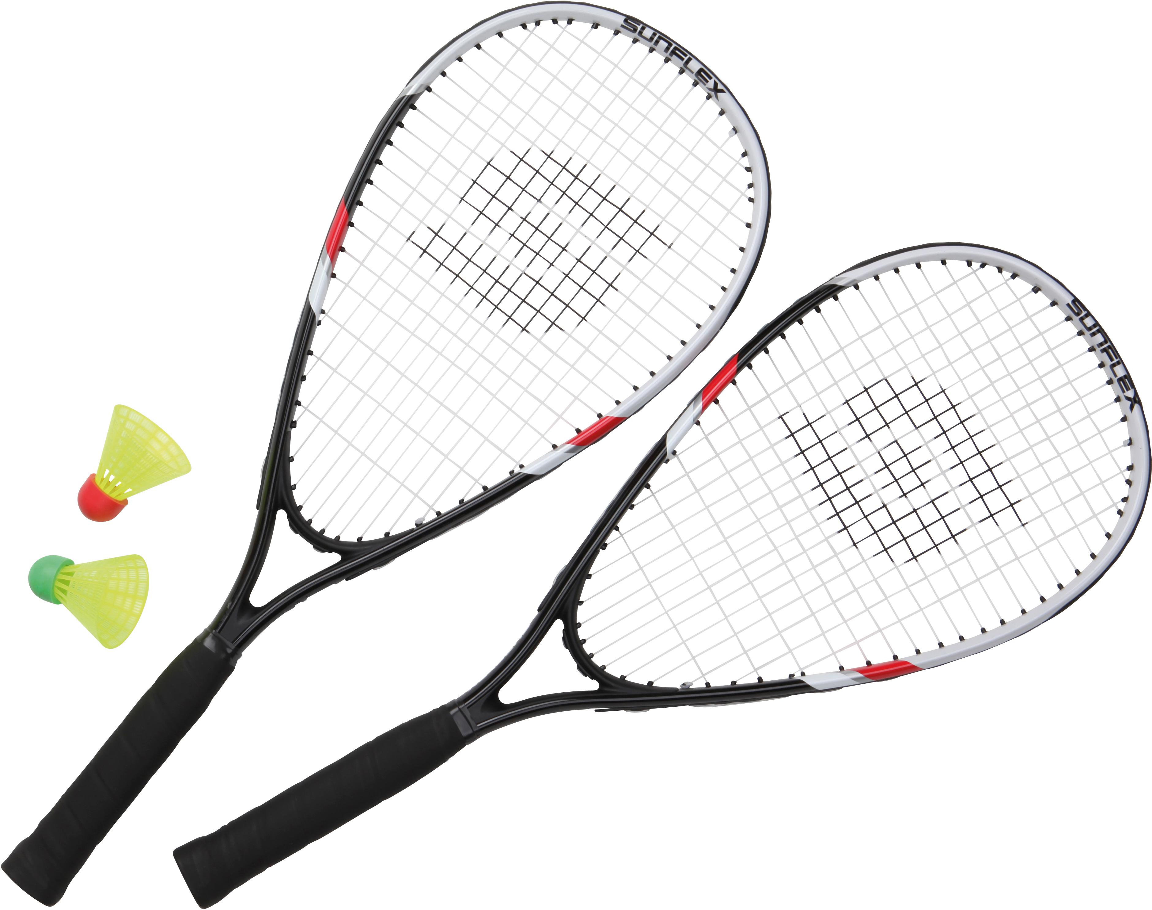 Actionreiches Badminton-Set inklusive 2 Aluschläger, 2 Bälle und 1 Tragetasche; ab 6 Jahren geeignet; Schläger sind besaitet; Länge: ca. 58,5 cm; Breite: ca. 22,5 cm; Gewicht: ca. 175 g (1 Schläger).