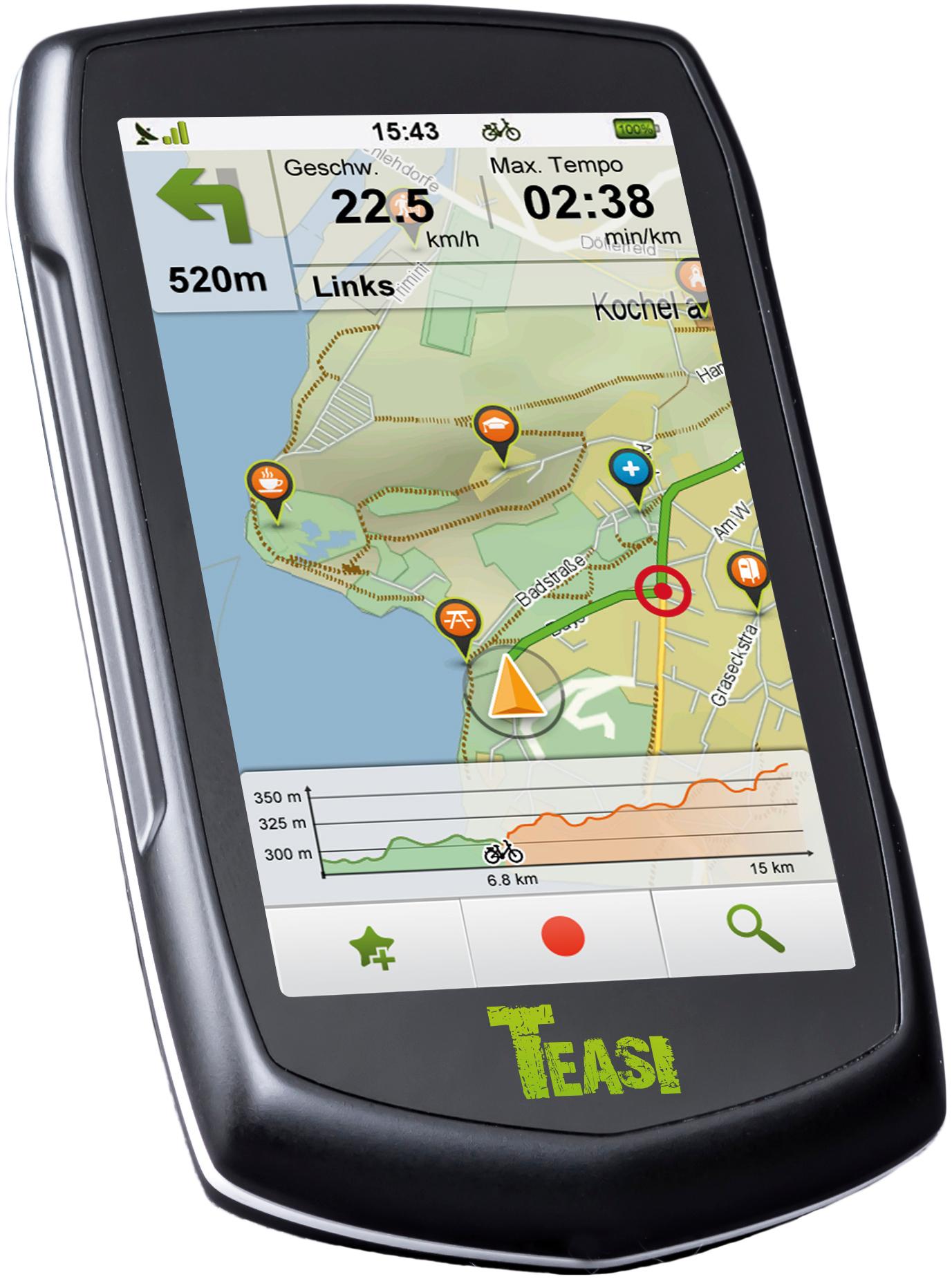 TEASI ONE 2. GPS Bundle inklusive vorinstallierte Fahrradtouren und Transporttasche. Das Navigationssystem eignet sich für alle Radfahrer, Wanderer, Fußgänger und Geocatcher, als Special Edition inklusive microSD-Karte mit 25 Tourenvorschlägen. Die neueste Ausgabe des Erfolgsmodells wurde mit einem größeren transflektiven Display, 8,8 cm (3,5") mit 480 x 800 Pixel Auflösung für optimale Ablesbarkeit bei Dunkelheit und Sonnenlicht, stärkerem Li-Polymer-Akku (2.300 mAh) und erweitertem Funktionsumfang ausgestattet. Unter anderem verfügt dasSystem über: Advanced Track Funktion (GPS track mit Bild und Beschreibung zu einzelnen POIs); 2 User-Modes (Basic= reduzierte Menüs, Expert= voller Menüzugriff); Routenspeicher für die letzten 5 aktiven Routen und es ermöglicht die flexible Nutzung des SD-Speichers. Damit werden alle wichtigen Funktionen für echte Navigation auf Straßen, Rad- und Wanderwegen in ganz Europa abgedeckt. Via bikemap.net/wandermap.net gibt's einfachen Zugriff auf weltweit über 1 Million Routen! Das Gerät begeistert mit durchdachter Menüführung, ist dank neuer EASY Mode-Funktion einfach und intuitiv zu bedienen und sofort ohne aufwändigen Installationsaufwand nach dem Auspacken startklar. Man kann Routen am heimischen PC planen und hochladen oder Ziele direkt auf dem Gerät auswählen und ansteuern. Die Karten sind routingfähig: einfach Ziel eingeben und das Gerät navigiert nach vorgegebenen Optionen direkt zum Ziel - wie vom Autonavi gewohnt. Übrigens: Kostenfreie Kartenaktualisierungen sind inklusive. Der integrierte Tripcomputer inklusive GPS-Kompass liefert Infos zu Streckenverlauf, Entfernung, Geschwindigkeit, Steigung, Höhenmetern und Kalorienverbrauch. 4GB Flash-Speicher reichen auch für größere Datenmengen. Der leistungsfähige Li-Polymer-Akkuhält bis zu 12 Stunden am Stück durch und eignet sich deshalb auch für ausdauernde Radler und Wanderer. Geladen wird der Akku einfach mittels USB-Kabel. Lieferumfang: Navigationssystem, Fahrradlenkerhalterung, 220V USB-Adapter, USB Daten- und Ladekabel, Bedienungsanleitung.