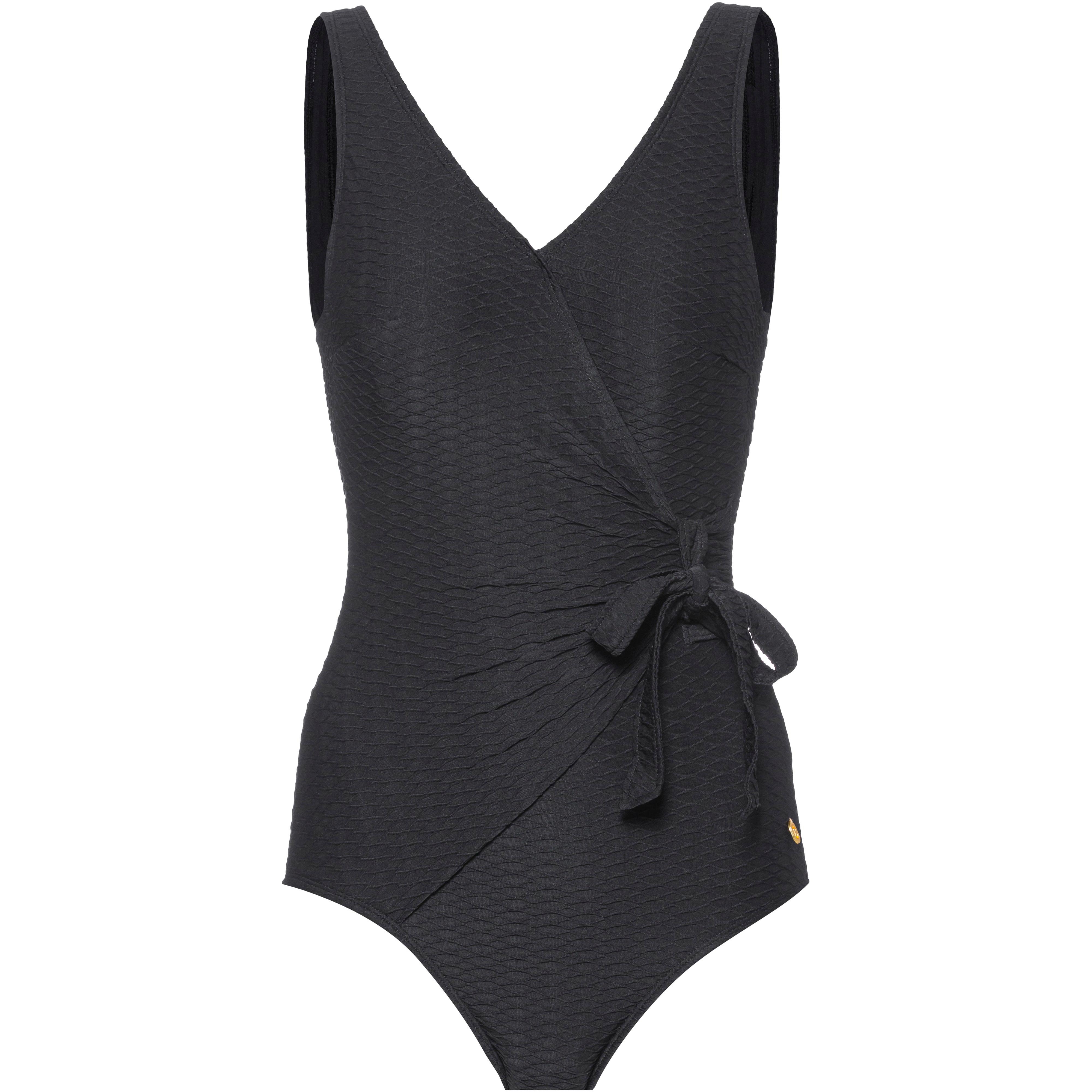 Badeanzug mit vorgeformten und gepolsterten Cups; breite Träger; strukturiertes Gewebe mit schnelltrocknender Funktion; Wickeloptik in der Front mit abnehmbarer Schleife; goldenes Markendetail; tiefer Rückenausschnitt; Material 77% Polyamid (recycelt), 23% Elastan.