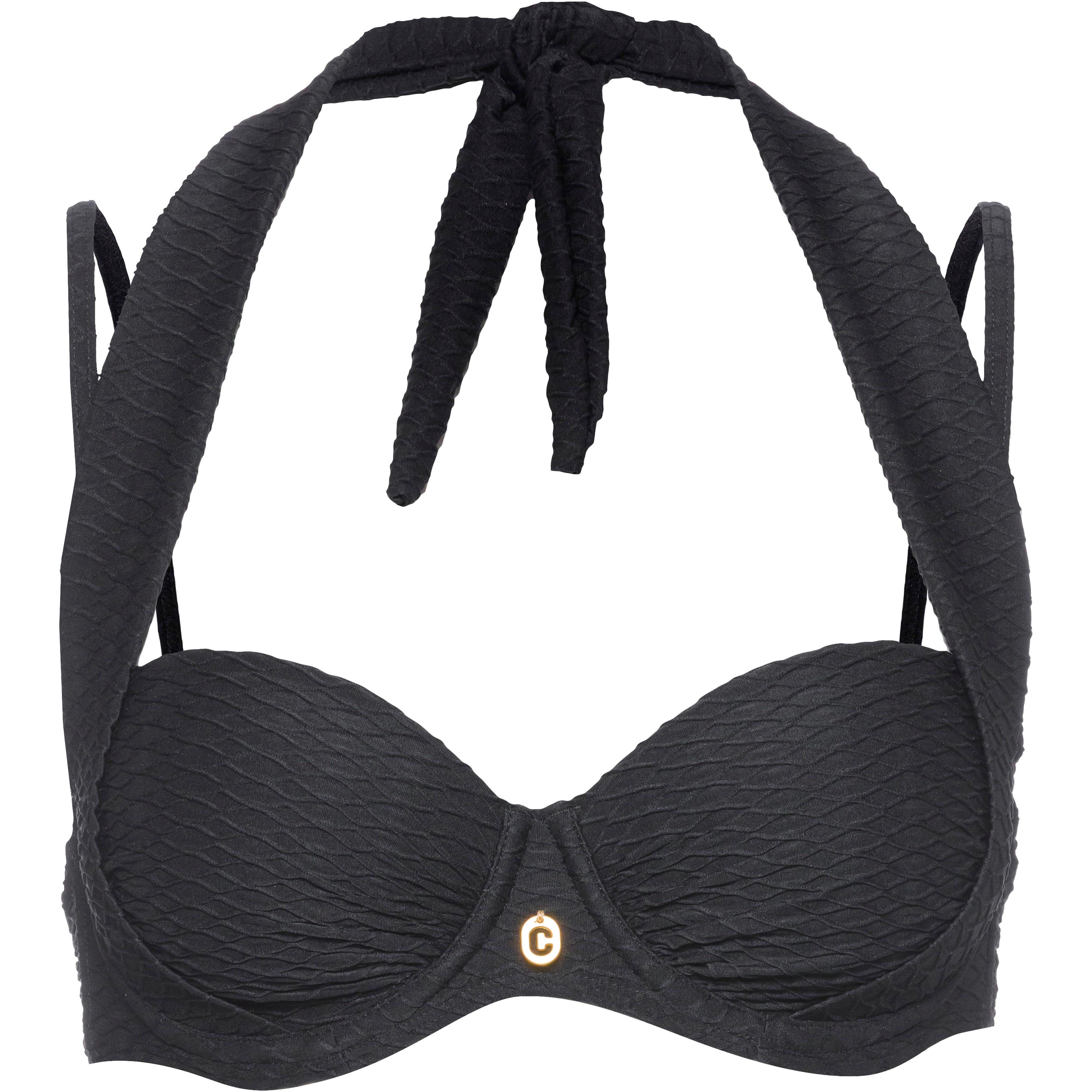 Bikini-Top mit Bügeln und wattierten Cups; Labelapplikation zwischen den Cups; dezente Raffungsdetails; Neckholder-Design zum Binden im Nacken; zusätzliche, längenverstellbare Spaghettiträger; Verschluss am Rücken; Material 77% Polyimid, 23% Elastan.