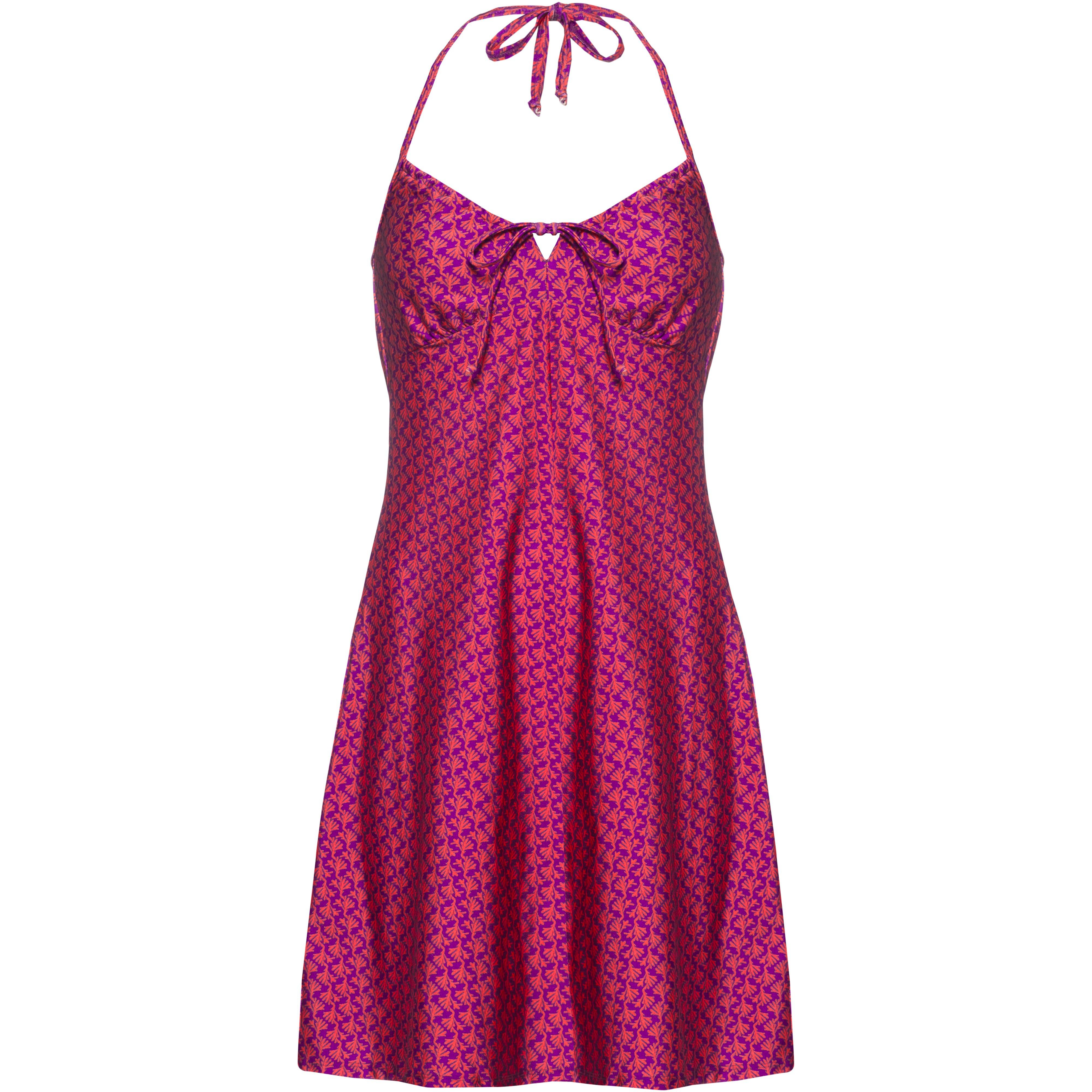 Kurzes Sommerkleid mit gemustertem Allover-Print; elastisches Material; Neckholder-Design mit schmalen Trägern zum Binden im Nacken; V-Ausschnitt mit Schleifendetail am Dekolletee; gerader Rückenabschluss; leicht ausgestellter, locker fallender Rock; Material 82% Polyamid, 18% Elastan.