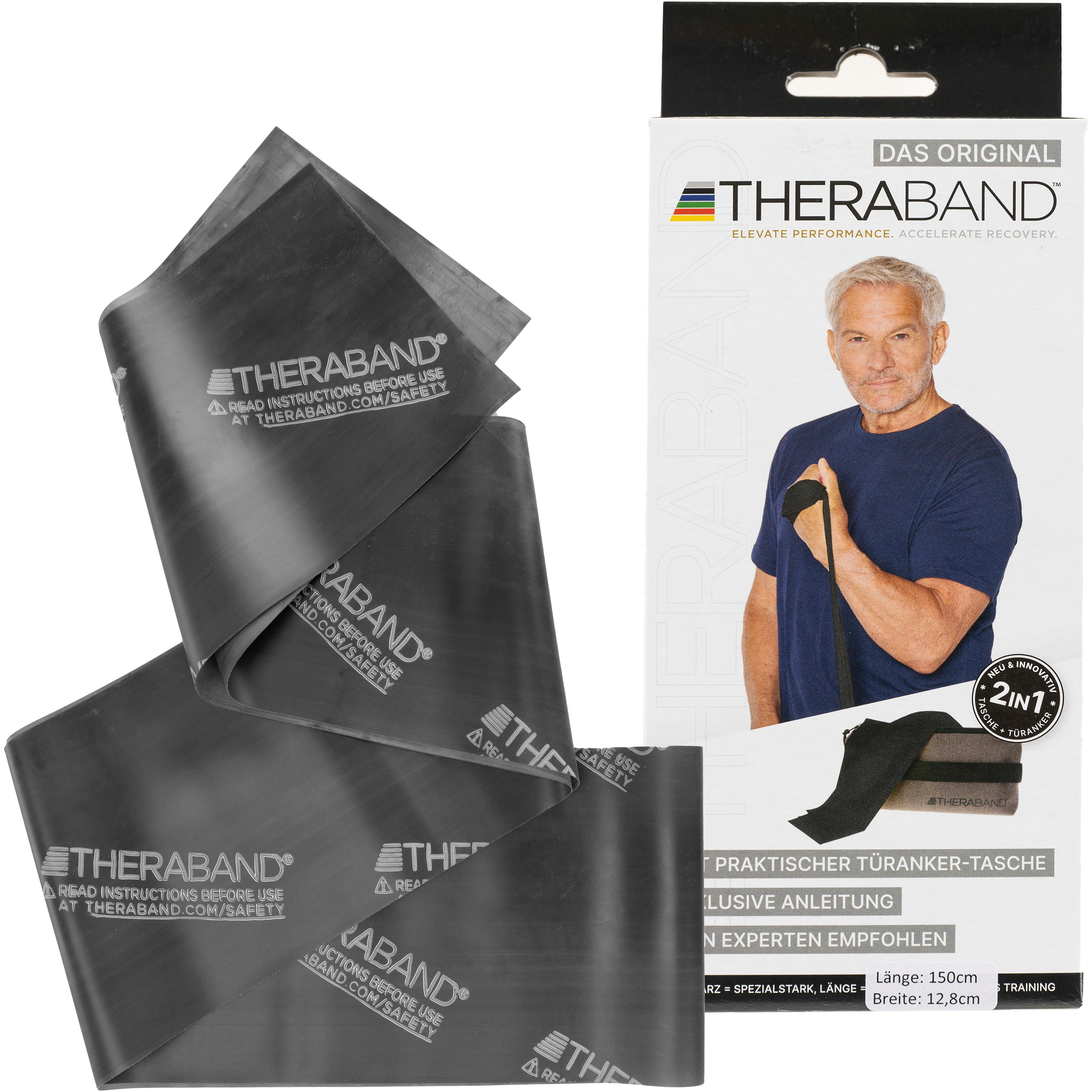 Gymnastikband mit praktischer Türanker-Tasche, für noch mehr Trainingsvariationen; Länge: ca. 150 cm; Breite: ca. 12,8 cm; verschiedene Stärken erhältlich: Gelb: leicht, Grün: stark, Rot: mittelstark, Blau: extrastark, Schwarz: spezialstark.