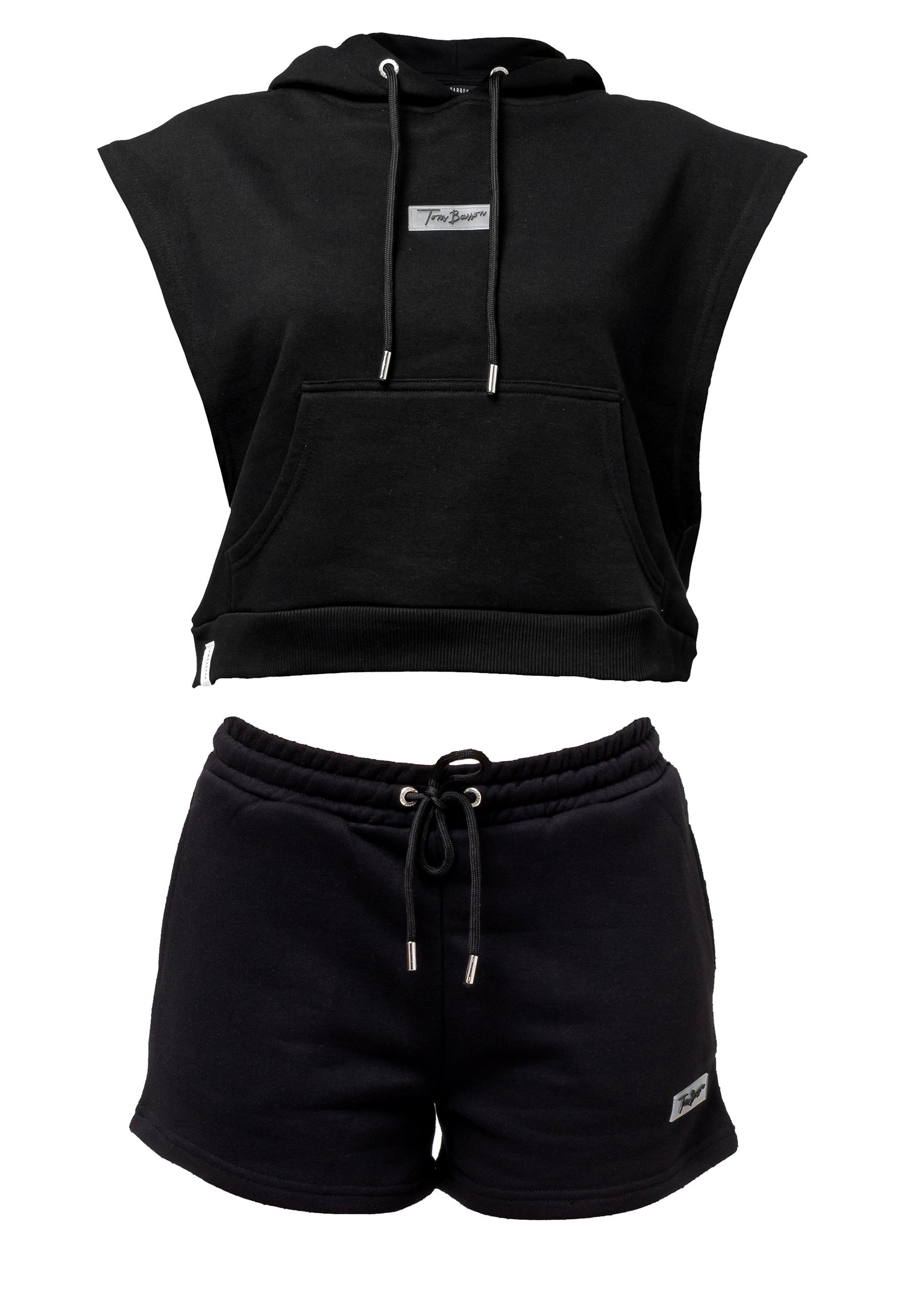 Modischer Freizeitanzug von TOM BARRON. Der sportive Zweiteiler, bestehend aus gecropptem Hoodie ohne Ärmeln und Shorts, ist ein urbanes Multitalent. Tonale abgesetzte Kordeln und schimmerne Applikationen sind echte Hingucker. Durch die weiche Baumwollqualität ist stets ein hoher Tragekomfort garantiert.