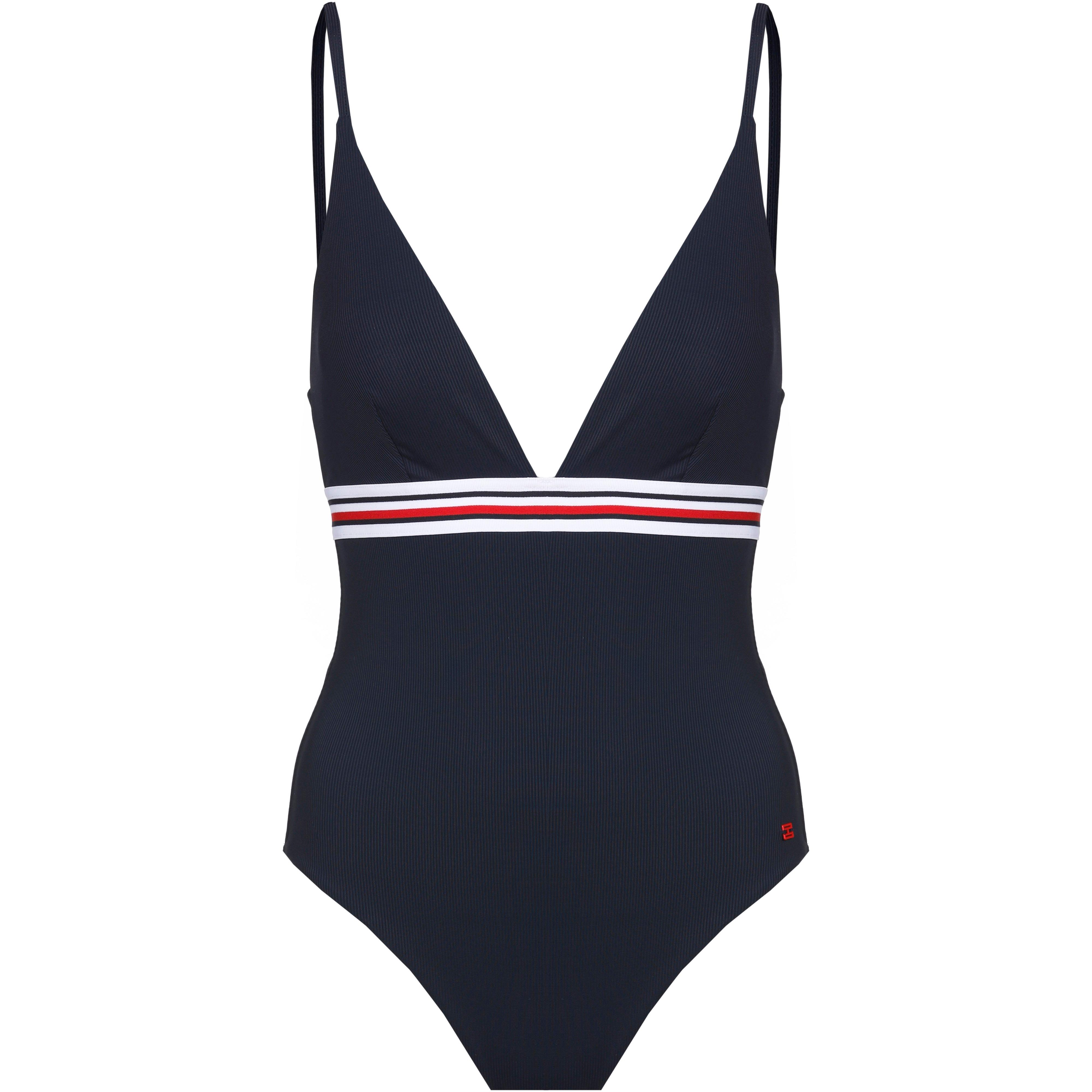 Badeanzug mit tiefem Ausschnitt und gestreiftem Unterbrustband; weiches Material mit dezent eingearbeitetem Streifenmuster; dünne, verstellbare Träger; Logodetail; Klickverschluss und Cut-out am Rücken; herausnehmbare Softpads; vollständig gefüttert; mit mind. 5% Recyclingmaterial hergestellt; Obermaterial 75% Polyamid, 25% Elastan, Futter 92% Polyester, 8% Elastan.