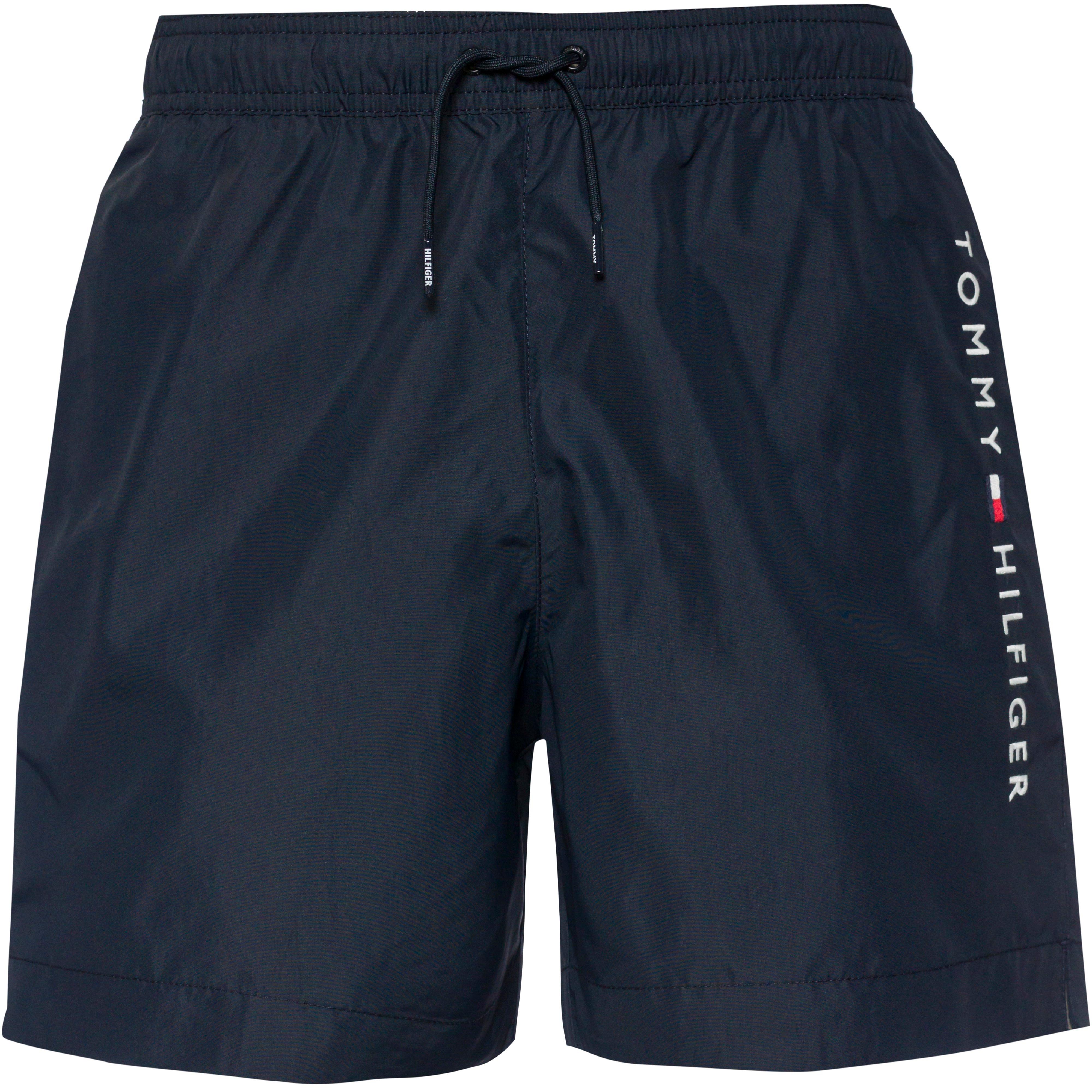 Mittellange Badeshorts mit elastischem Bund und Kordelzug; 2 Seitentaschen und 1 Gesäßtasche; kurze Seitenschlitze; Markenprint; Länge: ca. 40 cm (Größe M); Material 100% Polyester (recycelt).