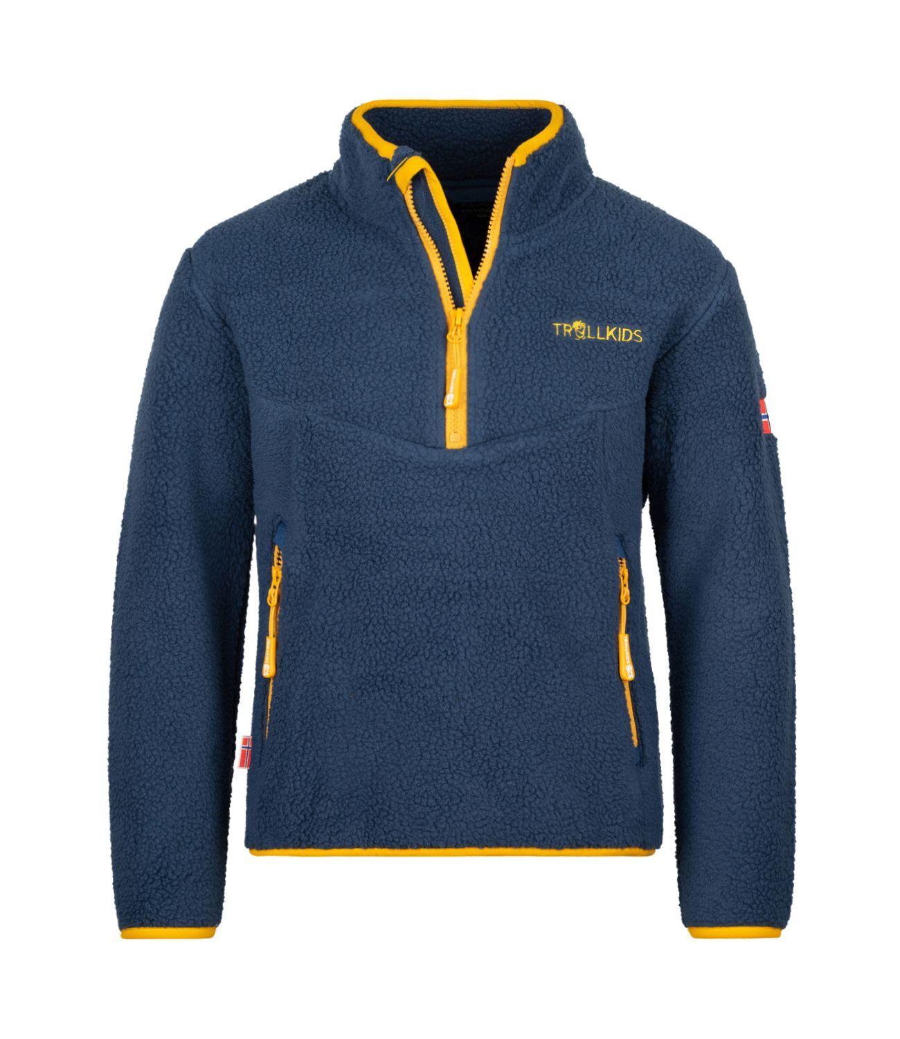 Schon allein beim Anblick des Materials steigt die gefühlte Temperatur: Hat man das KIDS HEMSEDAL HALF ZIP drunter, bleibt man auch bei Minusgraden kuschelig warm. Bei dem geradlinigen Half-Zip-Pullover setzen kontrastfarbene Reißverschlüsse und kontrastfarbene Einfassungen an Ärmeln, Kragen und Saum optische Akzente. In den beiden Reißverschluss-Taschen lassen sich Kleinigkeiten sicher verstauen. Gewicht: 310 g (Größe 128). Material: Sherpa-Fleece 300 g/m² (100 % Recyceltes Polyester).