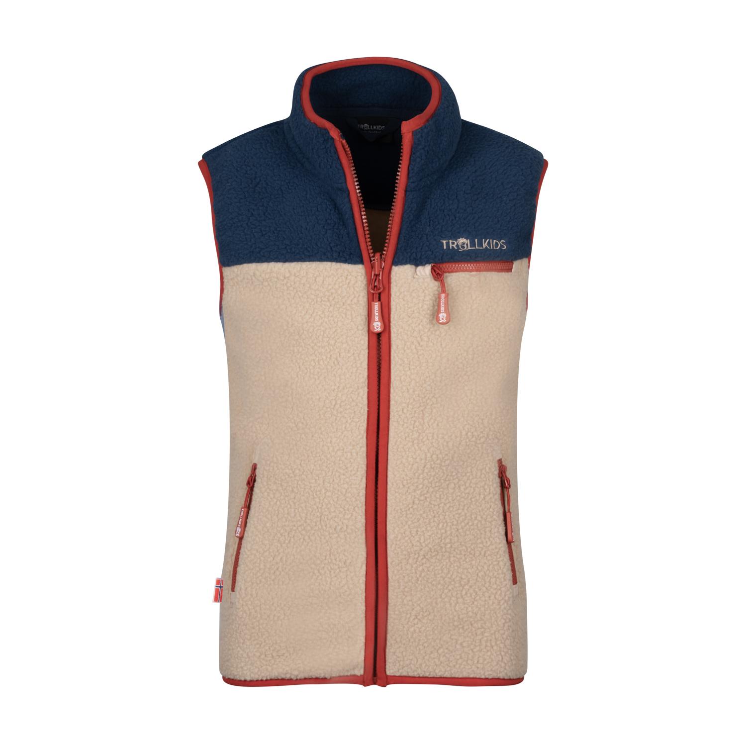 Das kuschelige, warme Sherpa-Fleece mit seiner charakteristischen Optik ist das Markenzeichen der KIDS HEMSEDAL VEST. Dazu kommen zwei seitliche Reißverschluss-Taschen in Hüfthöhe sowie eine Brusttasche, ebenfalls mit Reißverschluss. Weiterer Vorteil: Die KIDS HEMSEDAL VEST kann in wasserdichte TROLLKIDS-Jacken mit Zip-in-System hineingezippt werden.