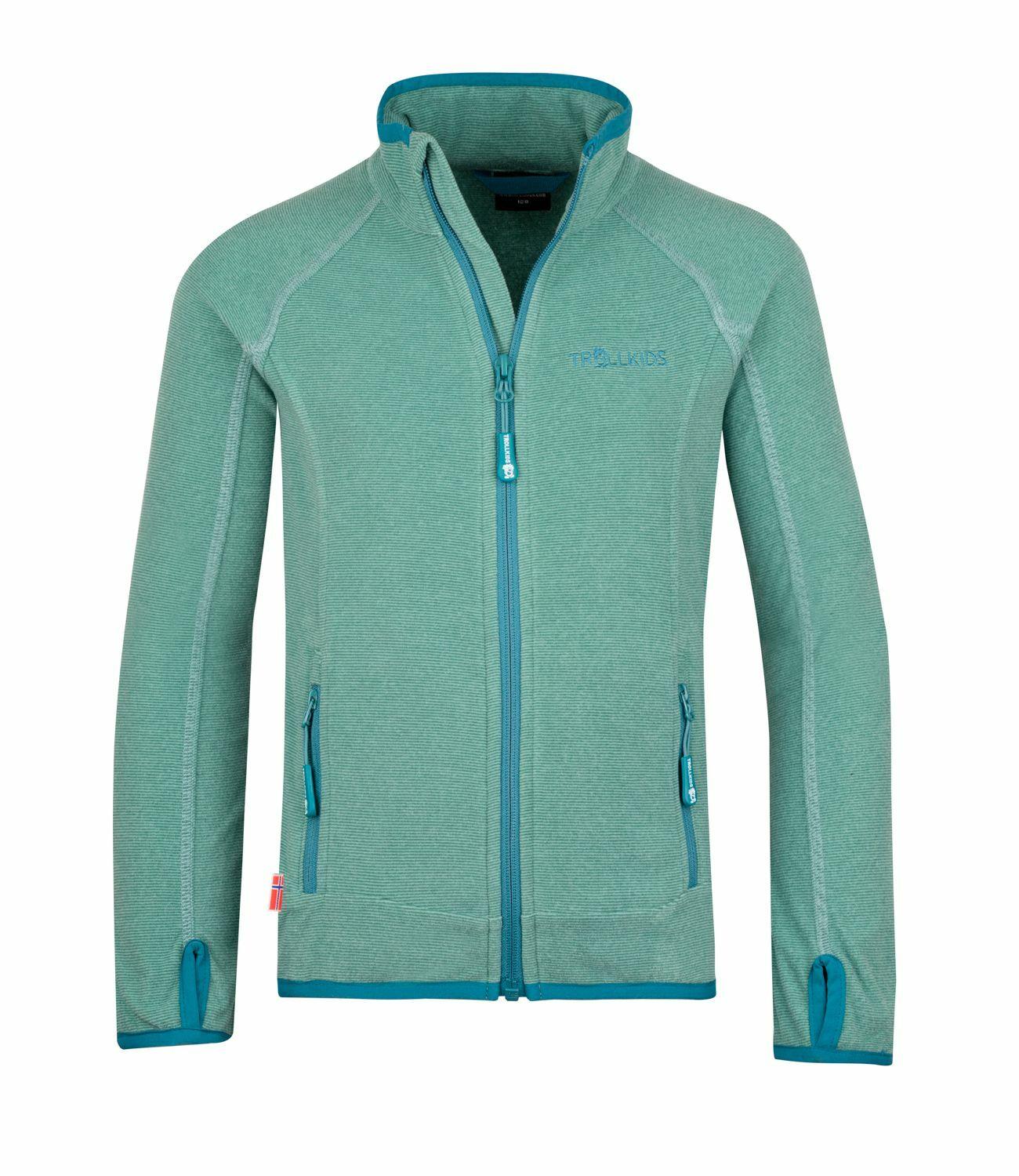 Eine schöne Nahtführung, ein fein gestreifter, kuscheliger Fleecestoff, zwei seitliche Eingrifftaschen mit Reißverschluss, Ärmelbündchen mit Daumenloch und ein dezenter TROLLKIDS-Schriftzug – fertig ist die Lieblingsfleecejacke. Gewicht: 200 g (Größe: 128).