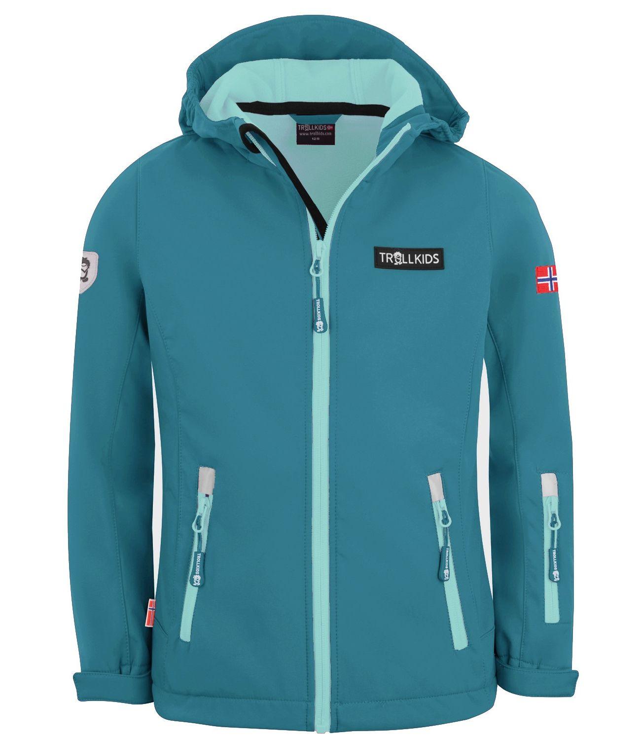 Leicht taillierte Softshell-Jacke für Mädchen mit Armtasche und Kontrastreißverschlüssen, wasserabweisend und winddicht, flexibel elastisch und flauschig warm. Ein echtes Muss für die Übergangszeit und für Aktivitäten, bei denen ein hoher Bewegungsfreiraum benötigt wird. Darüber hinaus ein modischer Hingucker! Mit Klettverschlüssen an den Armen kann die Weite der Ärmelbündchen angepasst werden, so dass kein Wind eindringt. Reflektoren befinden sich vorne und hinten, an den Oberarmen leuchtet die norwegische Flagge und der beliebte Lonely Troll aus dem TROLLKIDS-Logo.
