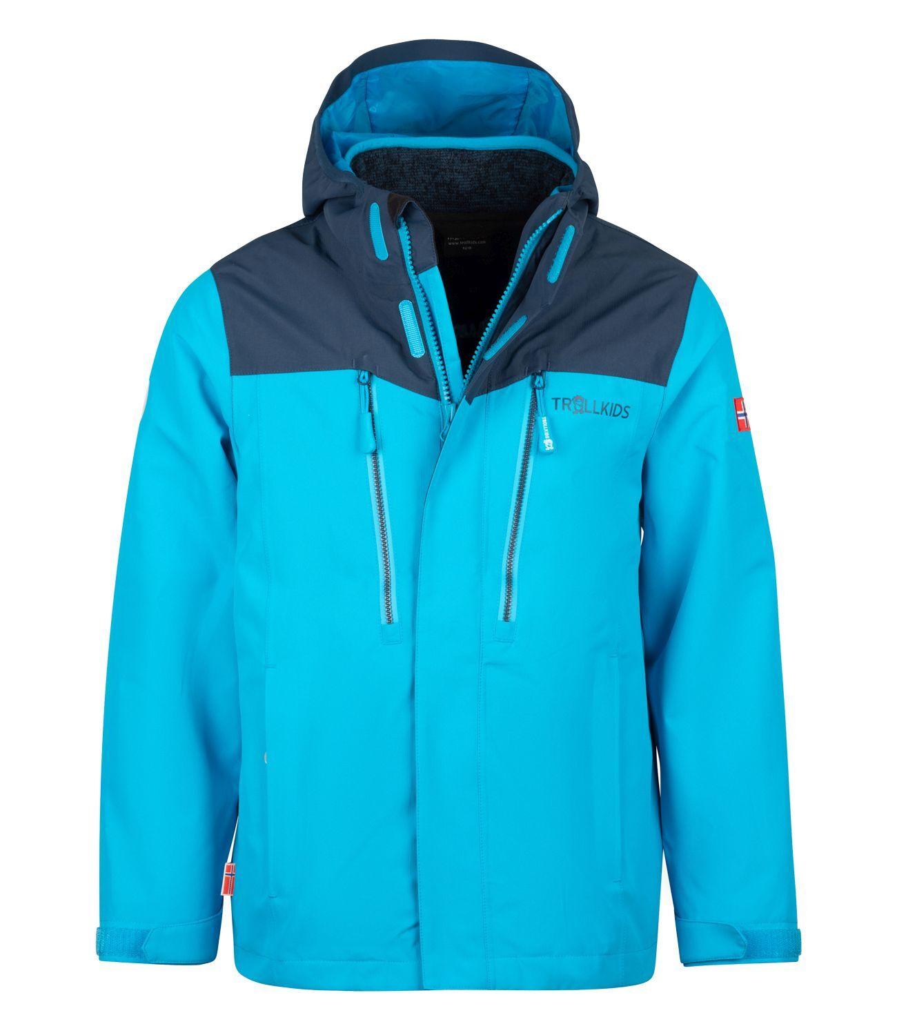 Die KIDS PREIKESTOLEN 3in1 JACKET ist eine wasserdichte und atmungsaktive Doppeljacke mit einer Außenjacke im modernen, geradlinigen Look und einer Innenjacke aus Strickfleece. Das Besondere an diesem Modell ist das weiche und doch robuste Ripstop-Material der Außenjacke, das sich schon in anderen Trollkids-Jacken bestens bewährt hat. Optisch wird die Außenjacke von ihrem kontrastfarbigen Brustbereich und zwei Brusttaschen mit markanten senkrechten Reißverschlüssen geprägt. Die verdeckten Hüfttaschen haben einen senkrechten Eingriff und sind mit Reißverschlüssen versehen, so dass Kleinigkeiten hier sicher verstaut werden können. Die angeschnittene Kapuze hat eine elastische Einfassung und ist zusätzlich hinten verstellbar. Die Ärmelabschlüsse sind mittels eines Klettverschlusses in der Weite regulierbar. Reflektierende Details erhöhen die Sichtbarkeit. Die Innenjacke aus Strickfleece hat eine weiche, angeraute Innenseite, zwei Taschen mit Reißverschluss und als ansprechendes optisches Detail kontrastfarbene Einfassungen an Ärmeln, Kragen und Saum. So macht sie auch alleine getragen eine gute Figur.