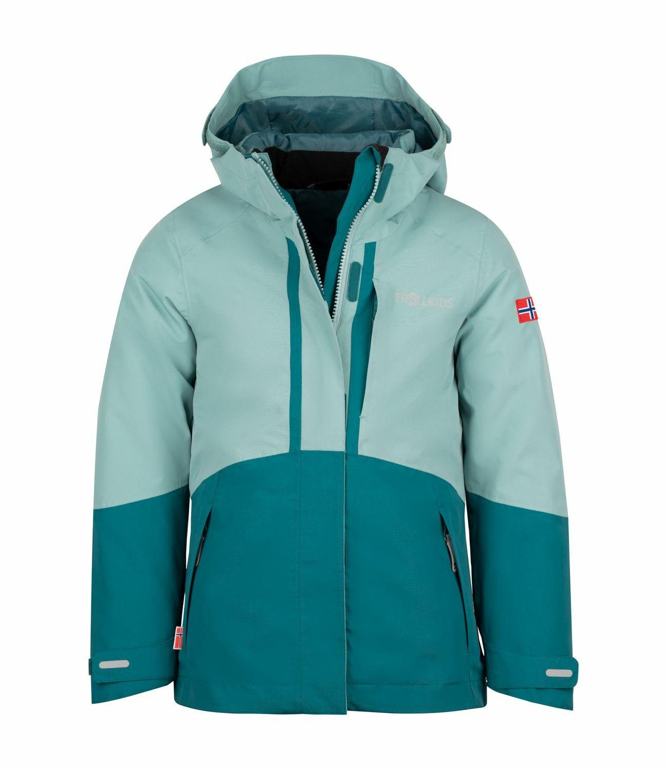 Diese GIRLS SKANDEN 3in1 JACKET lässt hinsichtlich Umweltfreundlichkeit und Vielseitigkeit keine Wünsche offen: Die Funktionsjacke ist komplett aus recyceltem Stoff hergestellt. Mit ihrer Kombination aus Hardshell und herausnehmbarer, wattierter Innenjacke ist sie das ganze Jahr über der passende Begleiter: Die wasserdichte, winddichte und atmungsaktive Außenjacke mit fester, verstellbarer Kapuze schützt vor Wind und Wetter. In den zwei seitlichen Taschen sowie der Brusttasche, jeweils mit Reißverschluss, ist alles, was mit muss, sicher verwahrt. Die Ärmelabschlüsse sowie der Bund sind in der Weite verstellbar. Die herausnehmbare wattierte Innenjacke mit sportlicher Steppung hält schön warm und kann an trockenen Tagen auch alleine getragen werden. Auch sie verfügt über zwei seitliche Reißverschlusstaschen.
