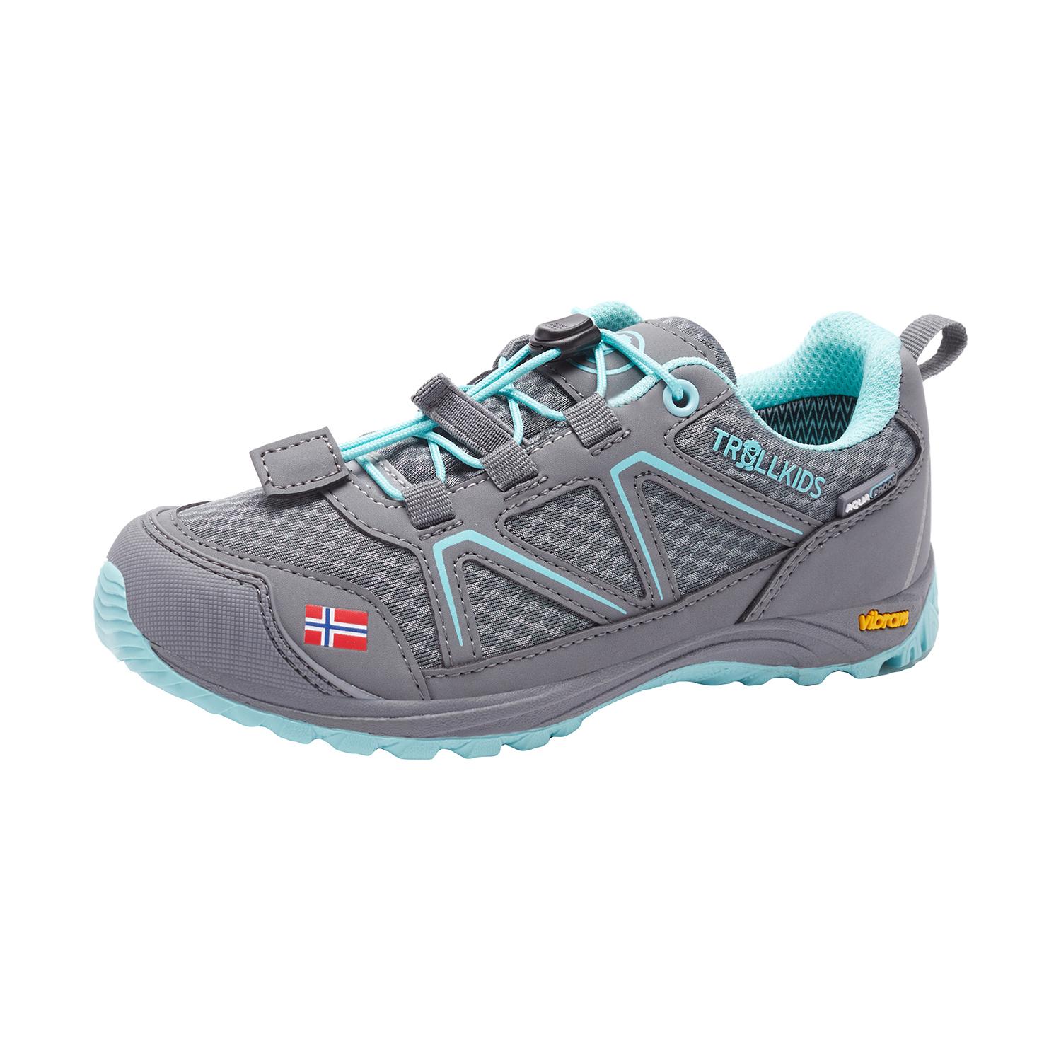 Ideal für lange Wandertouren, ausgedehnte Spaziergänge oder einfach zum Spielen und Toben: Der KIDS SKARVAN HIKER LOW ist ein sportlicher Wander-Halbschuh, der dank der AQUAPROOF-Membran wasserdicht und damit auch bei Regen in seinem Element ist. Der Schuh ist mit einem Schnellschnürsystem ausgestattet, so dass er selbst wenn‘s schnell gehen muss oder das Schuhebinden noch nicht sicher beherrscht wird in Sekundenschnelle an- und ausgezogen ist. Zum Schutz des Fußes ist die Zehenpartie verstärkt. Die besonders hochwertige, abriebfeste Vibram-Sohle sorgt für sicheren Halt und hohen Laufkomfort. Auf der Rückseite hat der KIDS SKARVEN HIKER LOW ein reflektierendes Element für bessere Sichtbarkeit. Gewicht: 490 g (Größe 31/32).